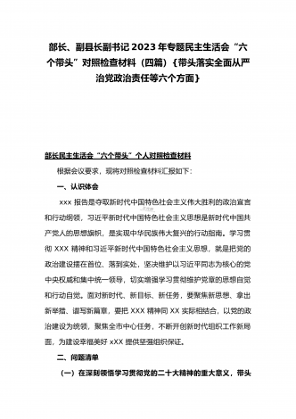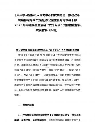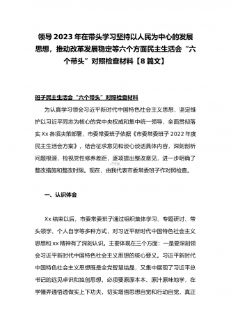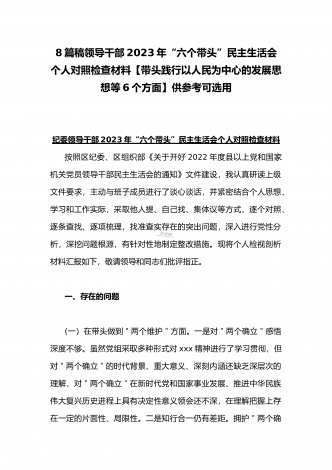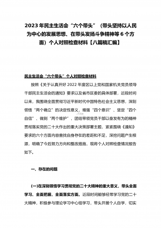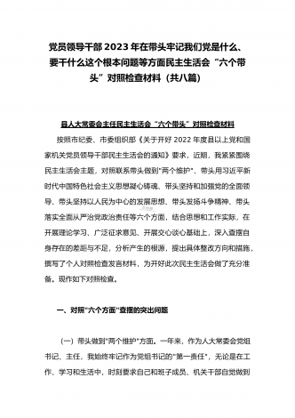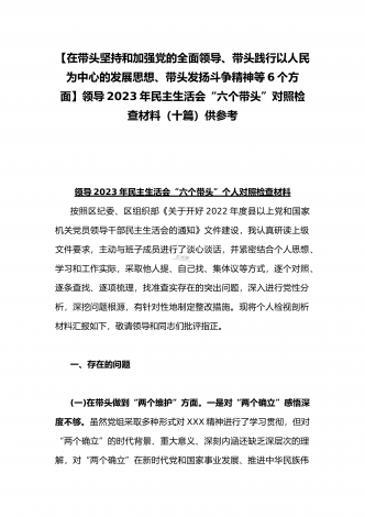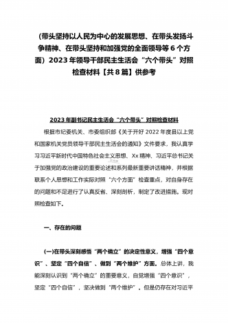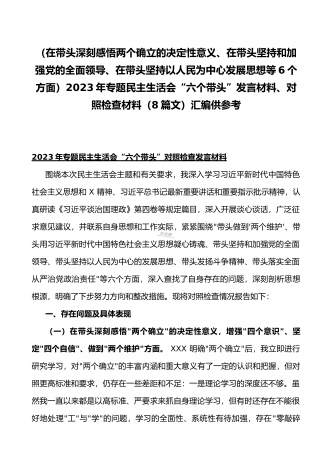 (在带头深刻感悟两个确立的决定性意义、在带头坚持和加强党的全面领导、在带头坚持以人民为中心发展思想等6个方面)2023年专题民主生活会“六个带头”发言材料、对照检查材料(8篇文)汇编供参考