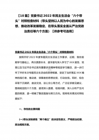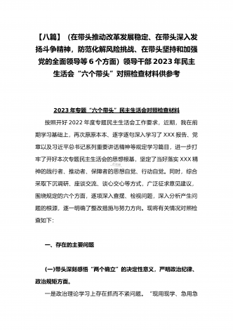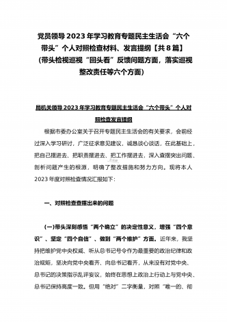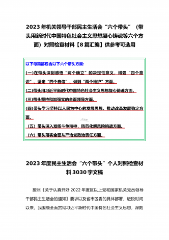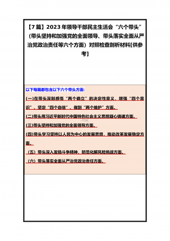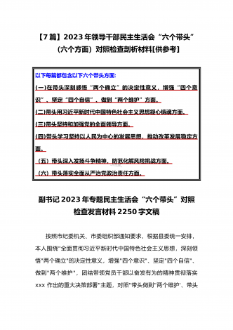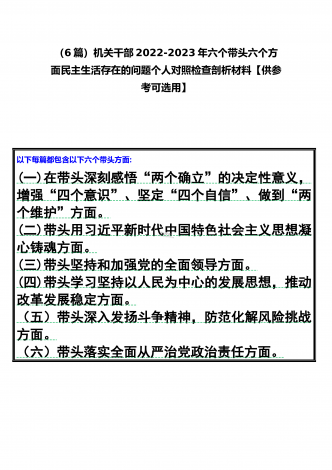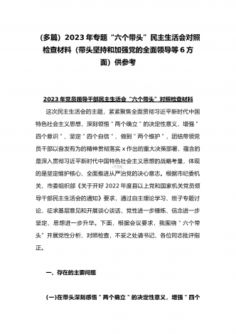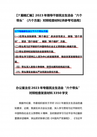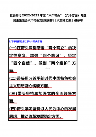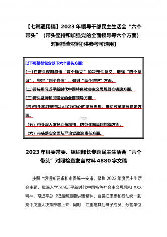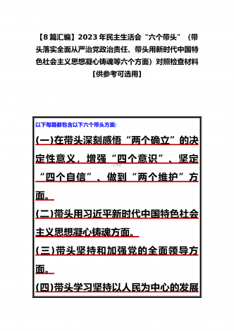 (在带头深刻感悟两个确立的决定性意义、在带头坚持和加强党的全面领导、在带头坚持以人民为中心发展思想等6个方面)2023年专题民主生活会“六个带头”发言材料、对照检查材料(8篇文)汇编供参考2023年专题民主生活会“六个带头”对照检查发言材料围绕本次民主生活会主题和有关要求,我深入学习习近平新时代中国特色社会主义思想和X精神、习近平总书记最新重要讲话和重要指示批示精神,认真研读《习近平谈治国理政》第四卷等规定篇目,深入开展谈心谈话,广泛征求意见建议,并联系自身思想和工作实际,紧紧围绕"带头做到&a...