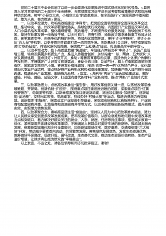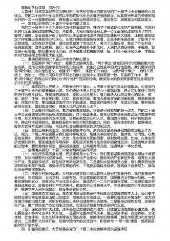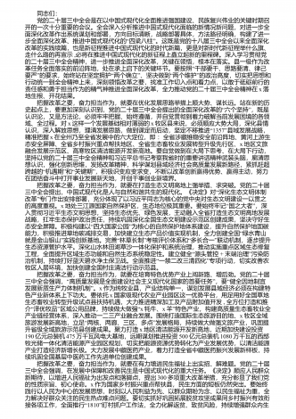 尊敬的各位领导、同志们: 大家好!非常荣幸能在这次研讨班上与各位交流学习贯彻党的二十届三中全会精神的心得体会。党的二十届三中全会是在以中国式现代化全面推进强国建设、民族复兴伟业的关键时期召开的一次十分重要的会议,具有重大而深远的政治意义、理论意义、战略意义和实践意义。 一、深刻认识党的二十届三中全会的重大意义 党的二十届三中全会为新时代新征程举旗定向,开辟了中国式现代化的广阔前景。它是对新时代全面深化改革的再动员、再部署,为我们在新征程上进一步全面深化改革指明了方向、提供了遵循。全会高...