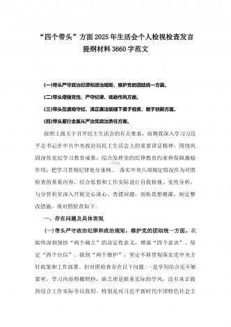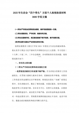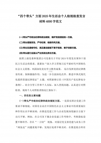 国有企业党委书记2025年生活会“四个带头”方面个人检视检查材料、发言提纲(两篇文)国有企业党委书记“四个带头”方面2025年生活会个人检视检查材料(一)带头严守政治纪律和政治规矩,维护党的团结统一方面。(二)带头增强党性、严守纪律、砥砺作风方面。(三)带头在遵规守纪、清正廉洁前提下勇于担责、敢于创新方面。(四)带头履行全面从严治党政治责任方面。根据公司党委《关于开好x2024年民主生活会的通知》要求,我紧扣本次民主生活会主题,通过自己查摆、谈心谈话、征求意见、走访调研等方式,围绕“四个方面”深...