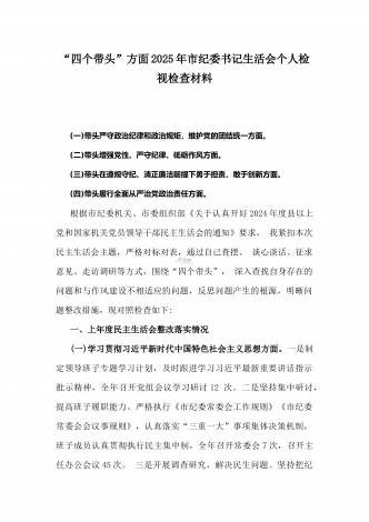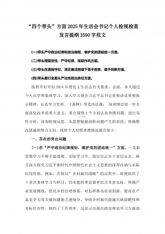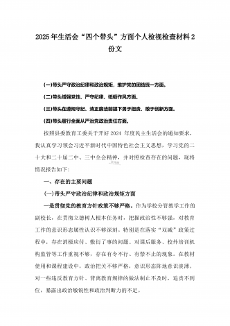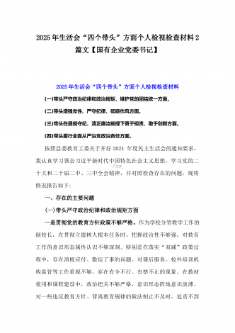 国有企业党委书记2025年生活会“四个带头”方面个人检视检查材料、发言提纲(两篇文)