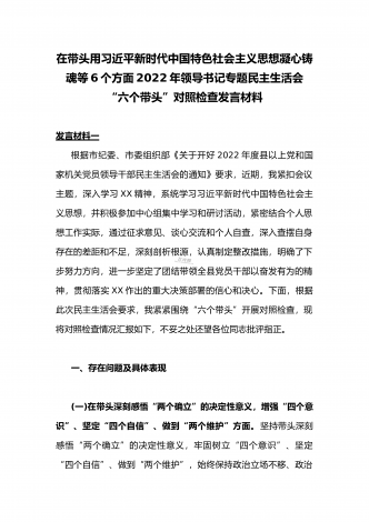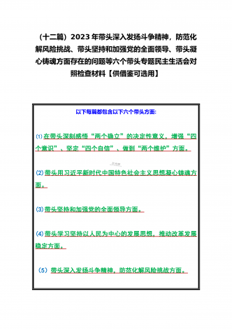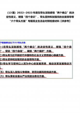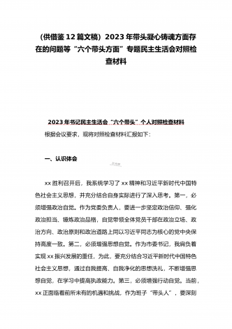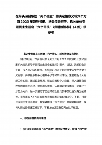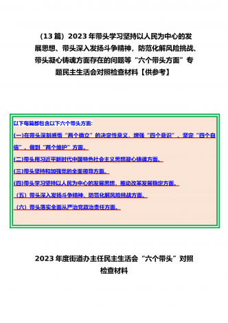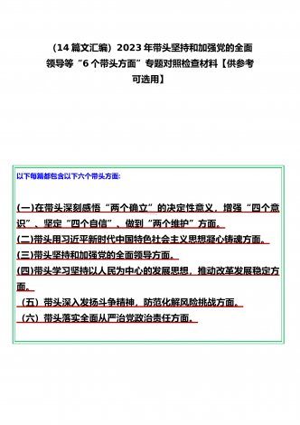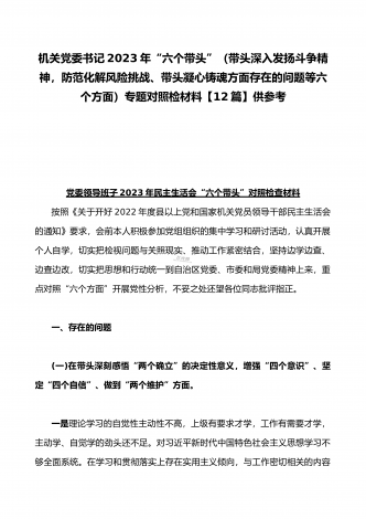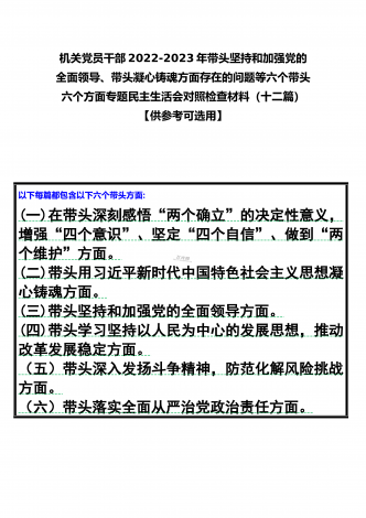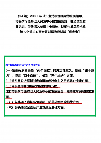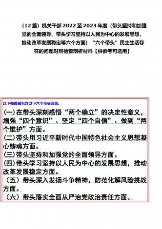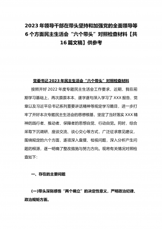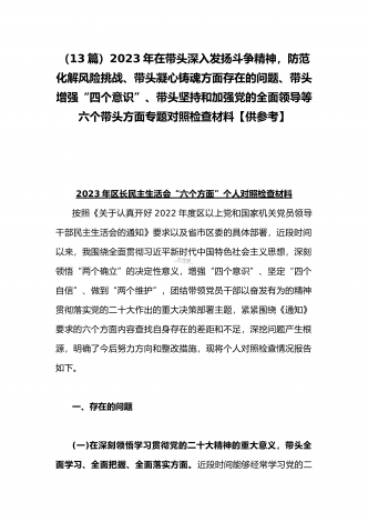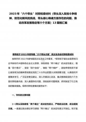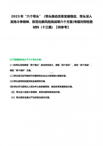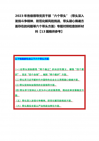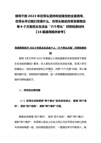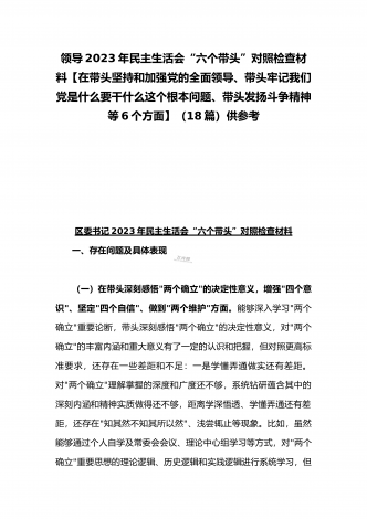 2023年领导民主生活会【在带头牢记我们党是什么、要干什么这个根本问题、带头坚持和加强党的全面领导、带头践行以人民为中心的发展思想、带头发扬斗争精神等6个方面】“六个带头”对照检查材料(十八篇)供参考副县长“六个带头”民主生活会个人对照检查材料按照《关于认真开好2022年度县以上党和国家机关党员领导干部民主生活会的通知》要求以及省市县委的具体部署,近段时间以来,我围绕全面贯彻习近平新时代中国特色社会主义思想,深刻领悟“两个确立”的决定性意义,增强“四个意识”、坚定“四个自信”、做到“两个维护”,...