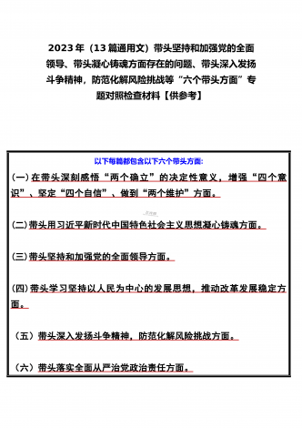 2023年领导民主生活会【在带头牢记我们党是什么、要干什么这个根本问题、带头坚持和加强党的全面领导、带头践行以人民为中心的发展思想、带头发扬斗争精神等6个方面】“六个带头”对照检查材料(十八篇)供参考