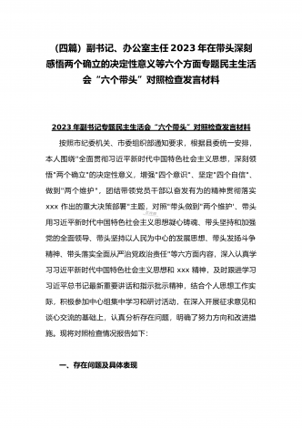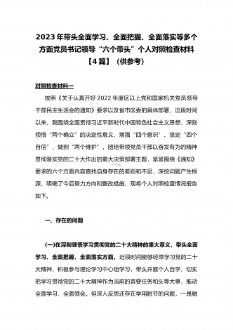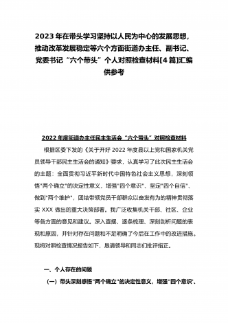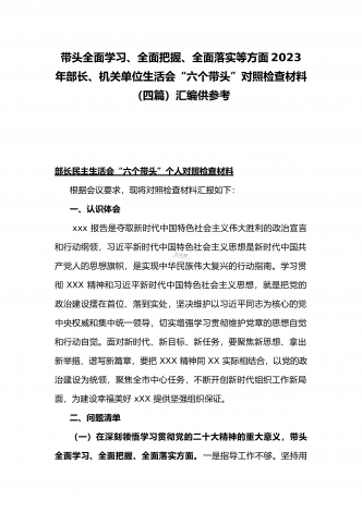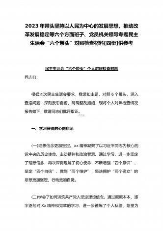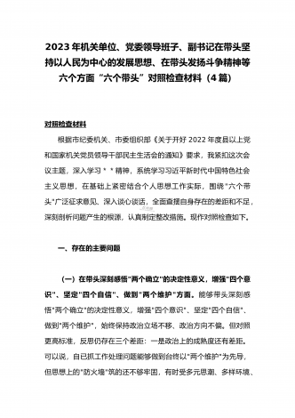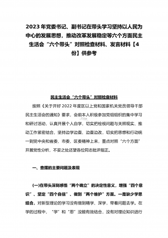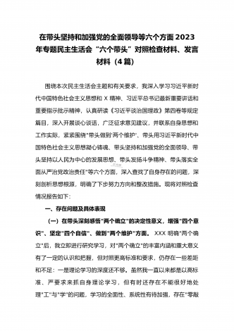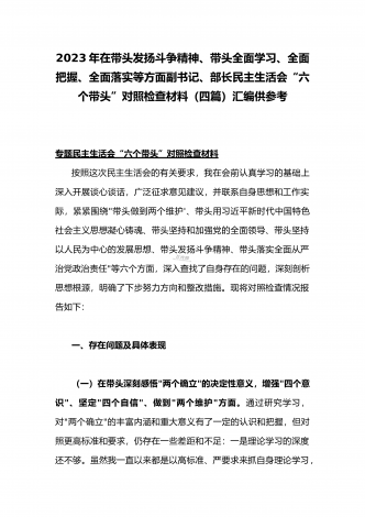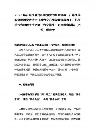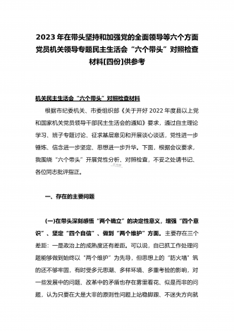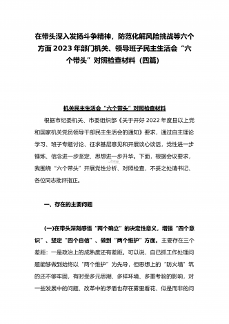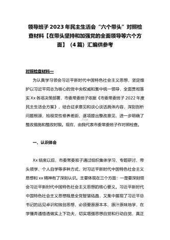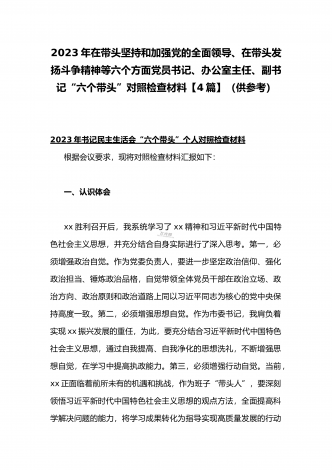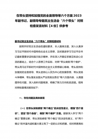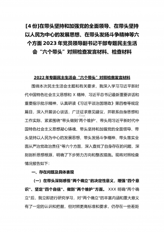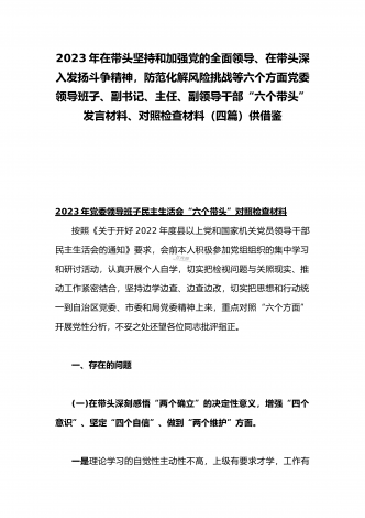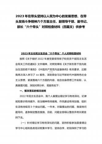 [4份]在带头坚持和加强党的全面领导、在带头坚持以人民为中心的发展思想、在带头发扬斗争精神等六个方面2023年党员领导副书记干部专题民主生活会“六个带头”对照检查发言材料、检查材料