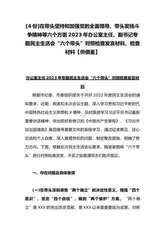 [4份]在带头坚持和加强党的全面领导、在带头坚持以人民为中心的发展思想、在带头发扬斗争精神等六个方面2023年党员领导副书记干部专题民主生活会“六个带头”对照检查发言材料、检查材料2022年专题民主生活会“六个带头”对照检查发言材料围绕本次民主生活会主题和有关要求,我深入学习习近平新时代中国特色社会主义思想和X精神、习近平总书记最新重要讲话和重要指示批示精神,认真研读《习近平谈治国理政》第四卷等规定篇目,深入开展谈心谈话,广泛征求意见建议,并联系自身思想和工作实际,紧紧围绕"带头做到'...