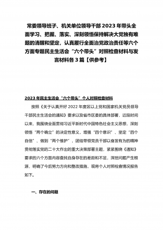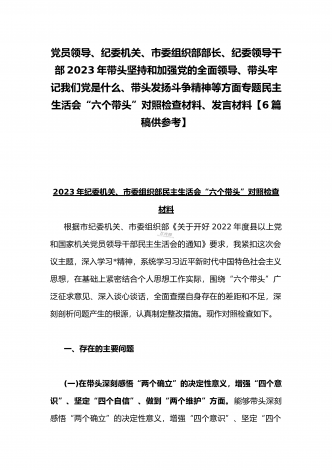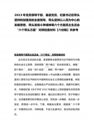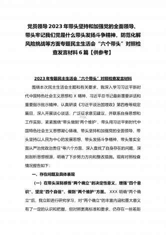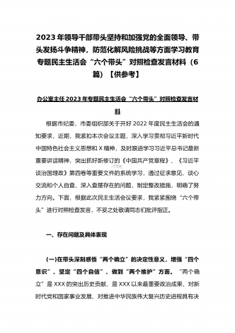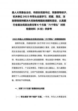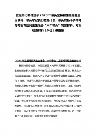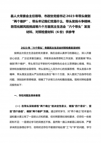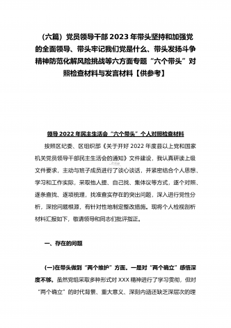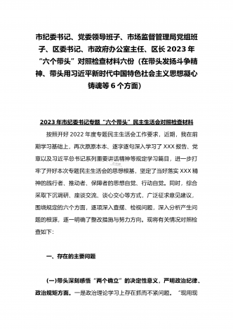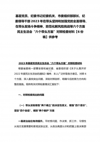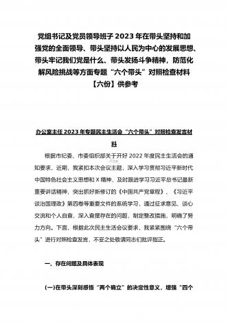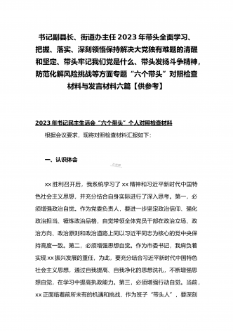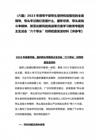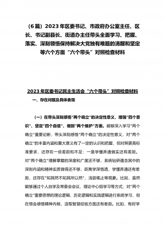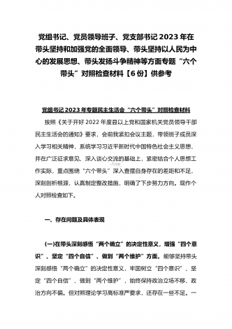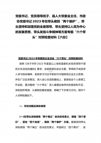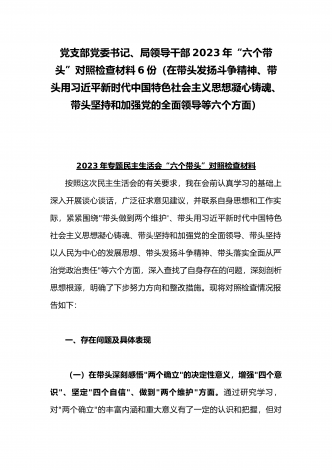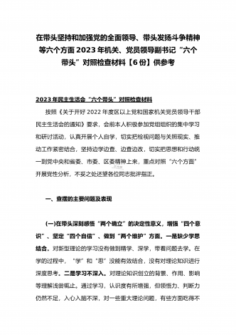 2022年党委书记、局领导干部、副县长、街道办主任(在带头用习近平新时代中国特色社会主义思想凝心铸魂、在带头坚持和加强党的全面领导、带头全面学习、把握、落实、深刻领悟保持解决大党独有难题的清醒和坚定等六个方面)“六个带头”对照检查材料六份【供参考】党委书记2023年民主生活会“六个带头”对照检查材料按照开好2022年度专题民主生活会工作要求,近期,我在前期学习基础上,再次原原本本、逐字逐句深入学习了XXX报告、党章以及习近平总书记系列重要讲话精神等规定学习篇目,进一步打牢了开好本次专题民主生活会...