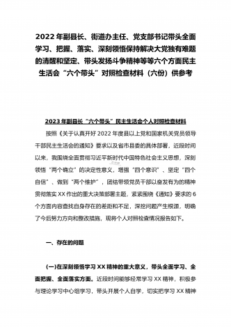 2022年党委书记、局领导干部、副县长、街道办主任(在带头用习近平新时代中国特色社会主义思想凝心铸魂、在带头坚持和加强党的全面领导、带头全面学习、把握、落实、深刻领悟保持解决大党独有难题的清醒和坚定等六个方面)“六个带头”对照检查材料六份【供参考】
