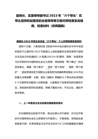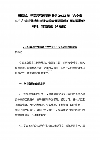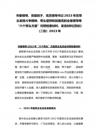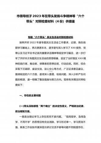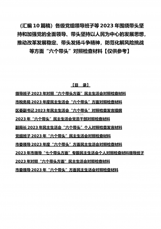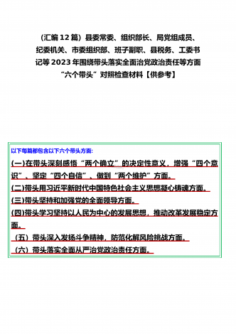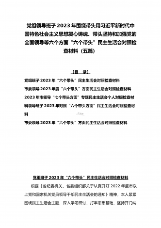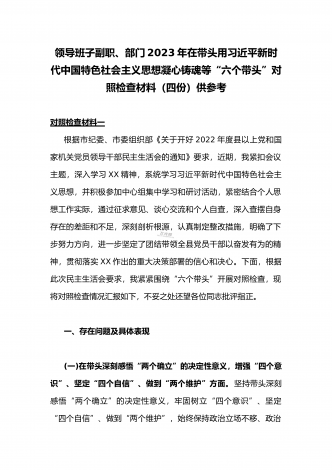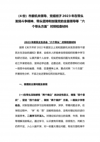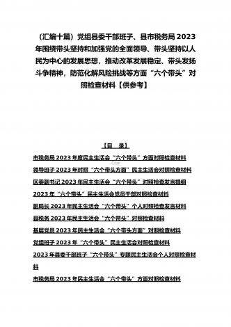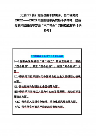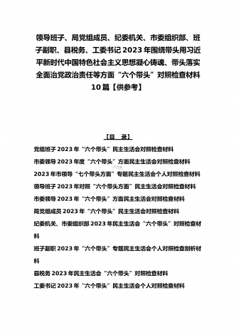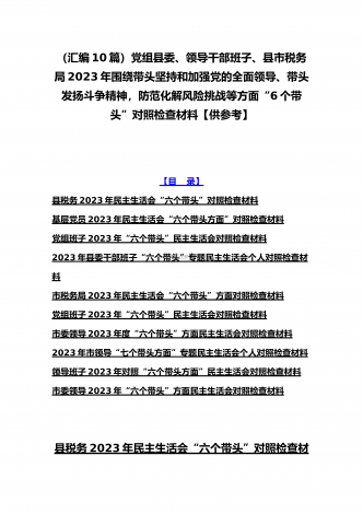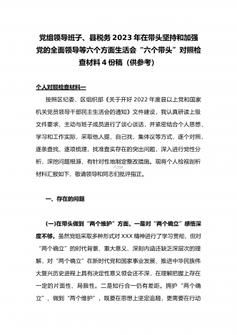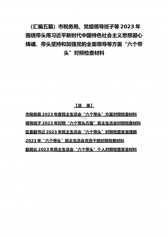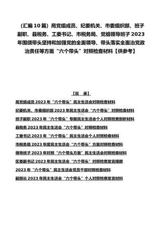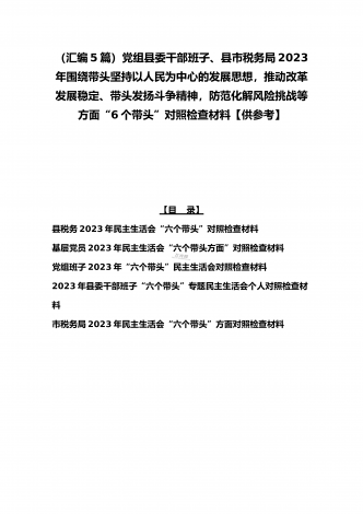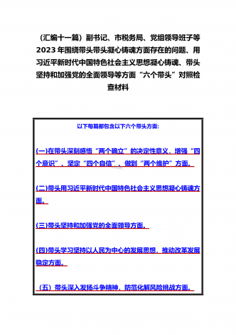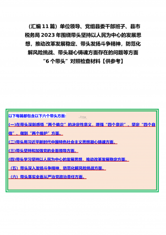 (汇编11篇)单位领导、党组县委干部班子、县市税务局2023年围绕带头坚持以人民为中心的发展思想,推动改革发展稳定、带头发扬斗争精神,防范化解风险挑战、带头凝心铸魂方面存在的问题等方面“6个带头”对照检查材料【供参考】
