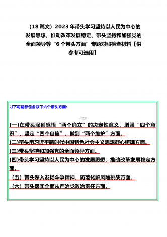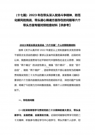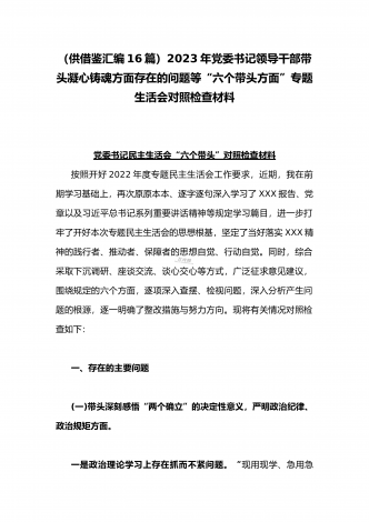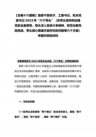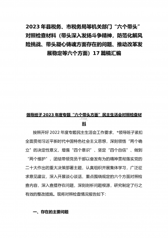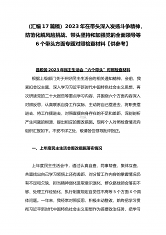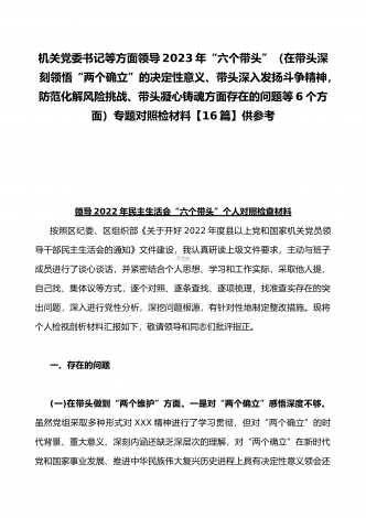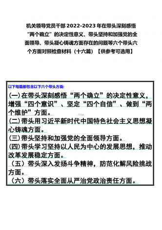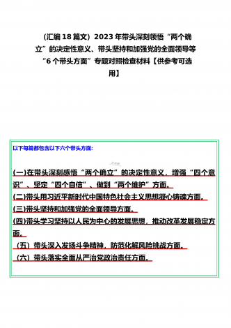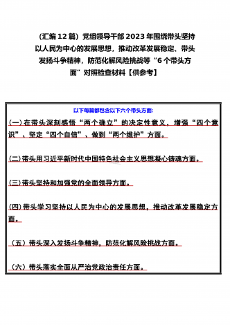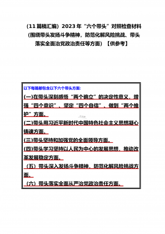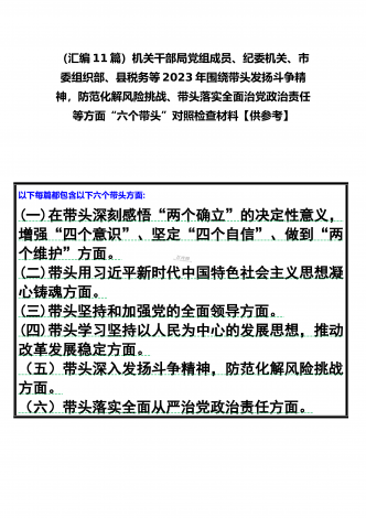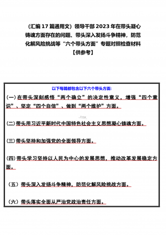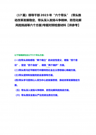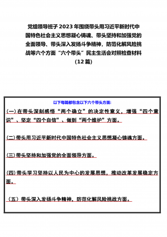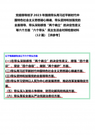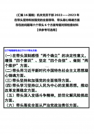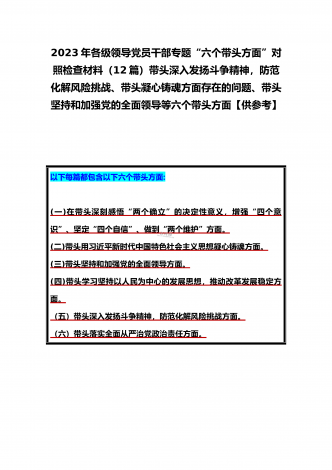 党组领导班子、党委书记2022——2023年度围绕带头用习近平新时代中国特色社会主义思想凝心铸魂、带头坚持和加强党的全面领导、带头发扬斗争精神,防范化解风险挑战等六个方面“六个带头”专题对照检材料【11篇】供参考以下每篇都包含以下六个带头方面:(一)在带头深刻感悟“两个确立”的决定性意义,增强“四个意识”、坚定“四个自信”、做到“两个维护”方面。(二)带头用习近平新时代中国特色社会主义思想凝心铸魂方面。(三)带头坚持和加强党的全面领导方面。(四)带头学习坚持以人民为中心的发展思想,推动改革发展稳...