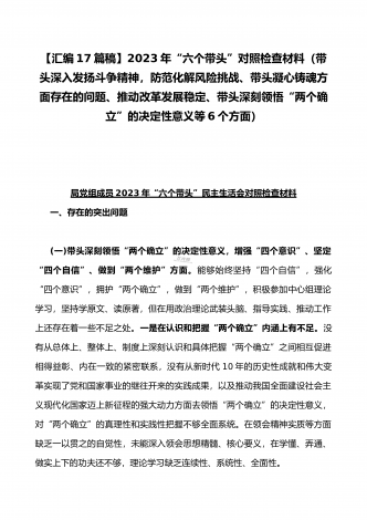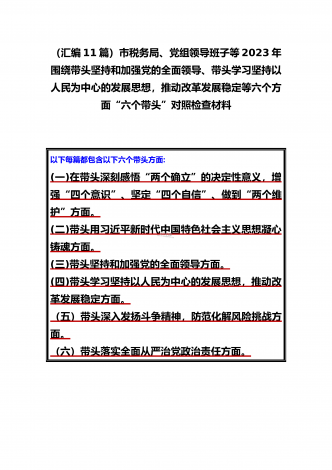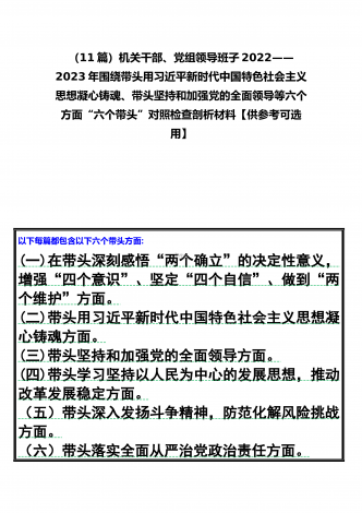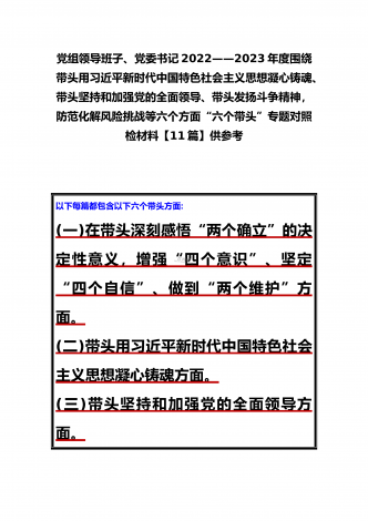 党组领导班子、党委书记2022——2023年度围绕带头用习近平新时代中国特色社会主义思想凝心铸魂、带头坚持和加强党的全面领导、带头发扬斗争精神,防范化解风险挑战等六个方面“六个带头”专题对照检材料【11篇】供参考