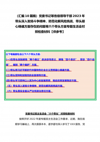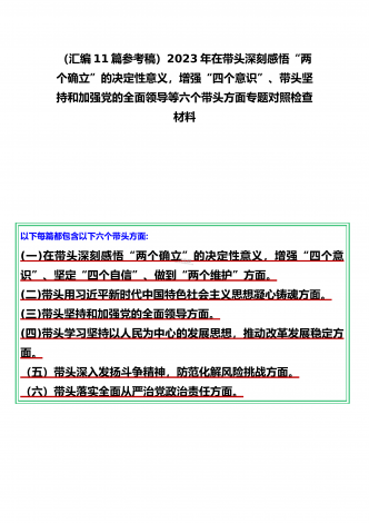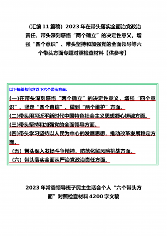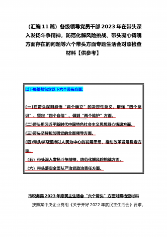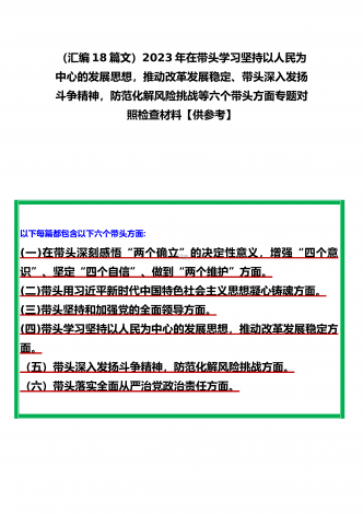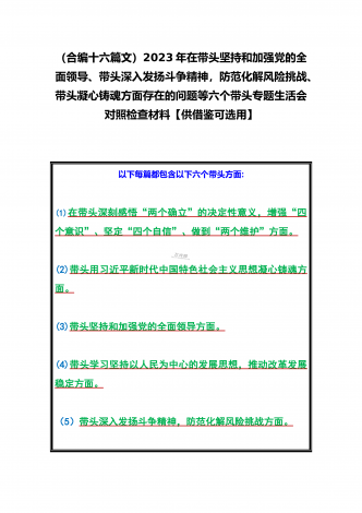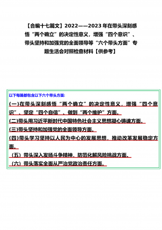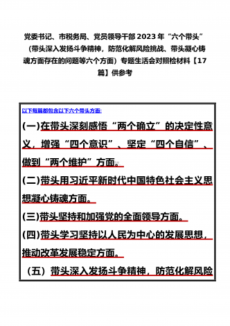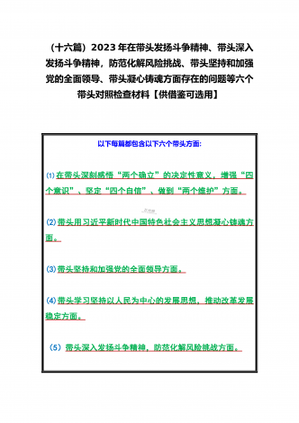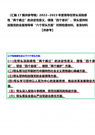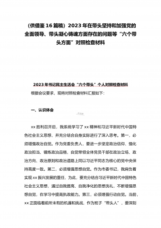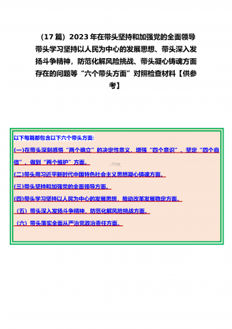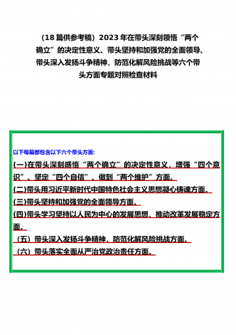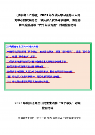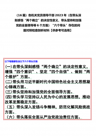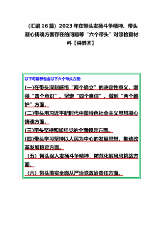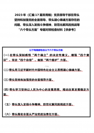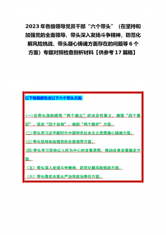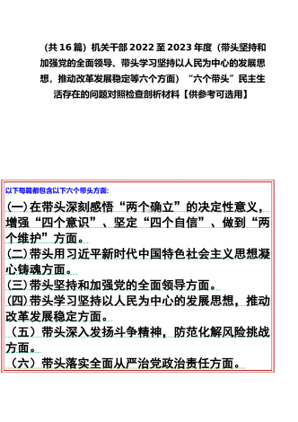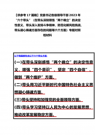 (共16篇)机关干部2022至2023年度(带头坚持和加强党的全面领导、带头学习坚持以人民为中心的发展思想,推动改革发展稳定等六个方面)“六个带头”民主生活存在的问题对照检查剖析材料【供参考可选用】以下每篇都包含以下六个带头方面:(一)在带头深刻感悟“两个确立”的决定性意义,增强“四个意识”、坚定“四个自信”、做到“两个维护”方面。(二)带头用习近平新时代中国特色社会主义思想凝心铸魂方面。(三)带头坚持和加强党的全面领导方面。(四)带头学习坚持以人民为中心的发展思想,推动改革发展稳定方面。(五)...