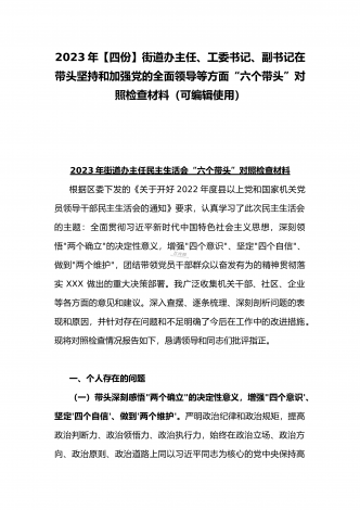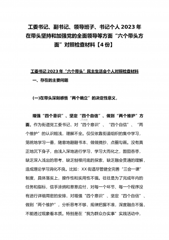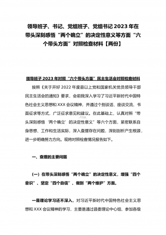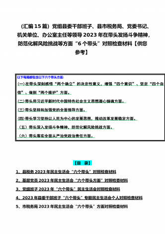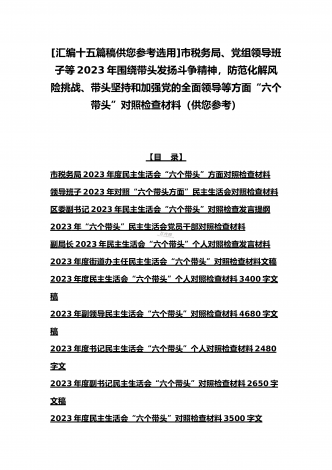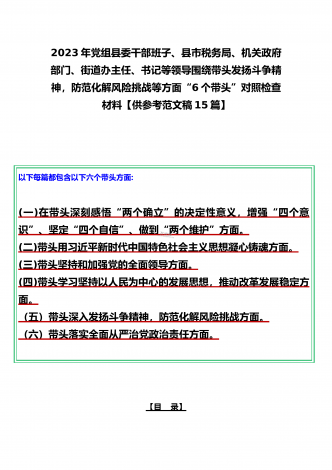 机关政府部门领导、党委书记、局党组成员、纪委机关、市委组织部、班子副职、县税务、工委书记等2023年在带头坚持以人民为中心的发展思想、带头发扬斗争精神、带头落实全面治党政治责任等方面“六个带头”对照检查材料【供您参考】