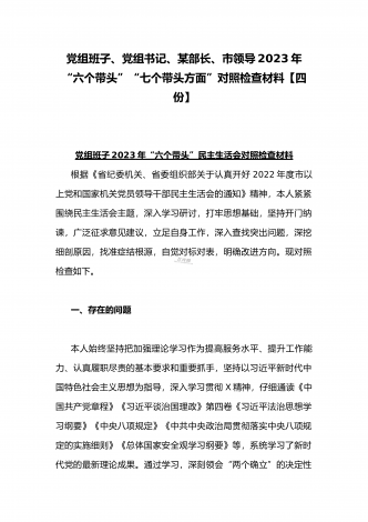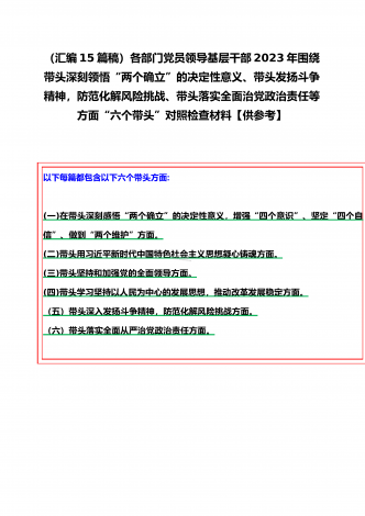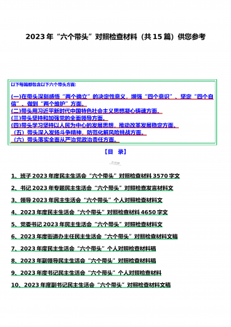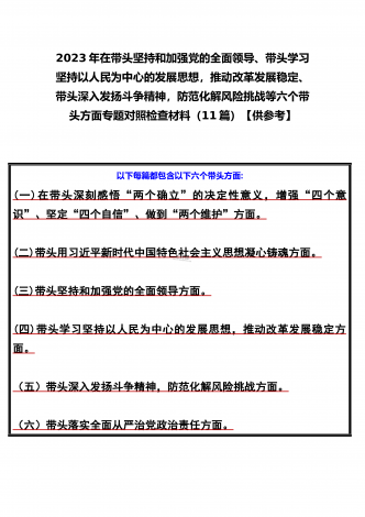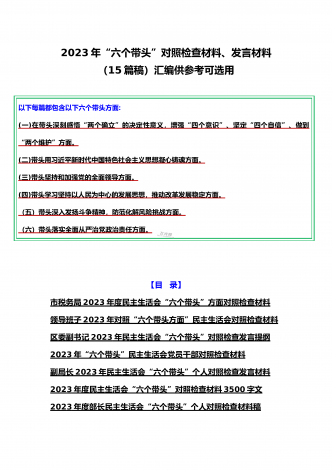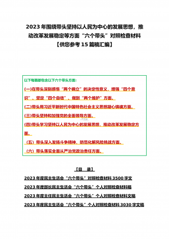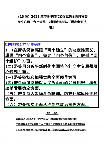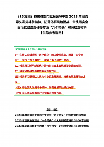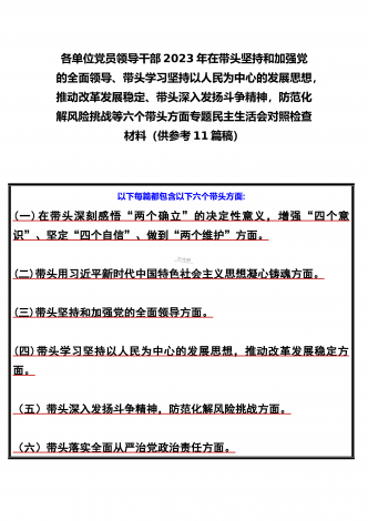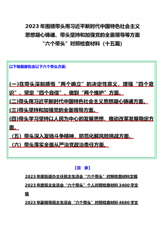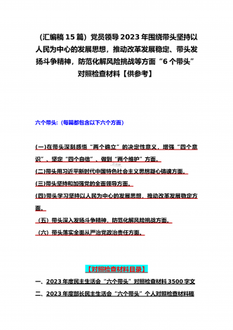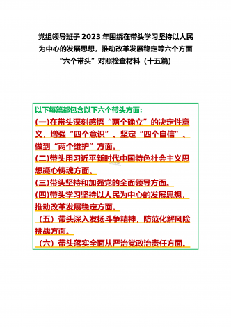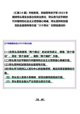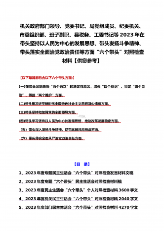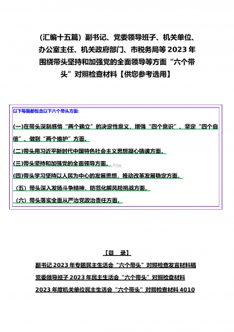 机关政府部门领导、党委书记、局党组成员、纪委机关、市委组织部、班子副职、县税务、工委书记等2023年在带头坚持以人民为中心的发展思想、带头发扬斗争精神、带头落实全面治党政治责任等方面“六个带头”对照检查材料【供您参考】【以下每篇都包含以下六个带头方面:】(一)在带头深刻感悟“两个确立”的决定性意义,增强“四个意识”、坚定“四个自信”、做到“两个维护”方面。(二)带头用习近平新时代中国特色社会主义思想凝心铸魂方面。(三)带头坚持和加强党的全面领导方面。(四)带头学习坚持以人民为中心的发展思想,推动...