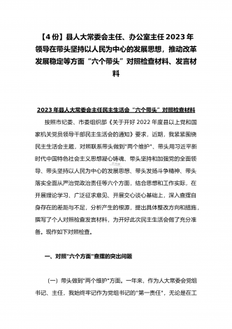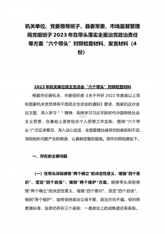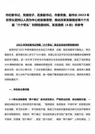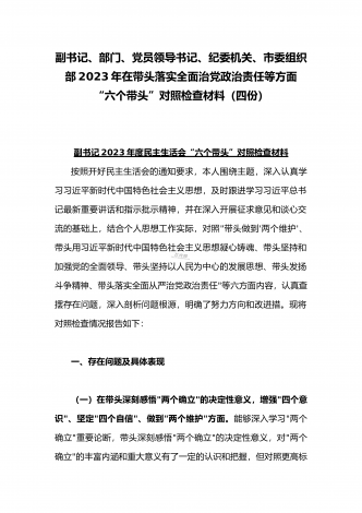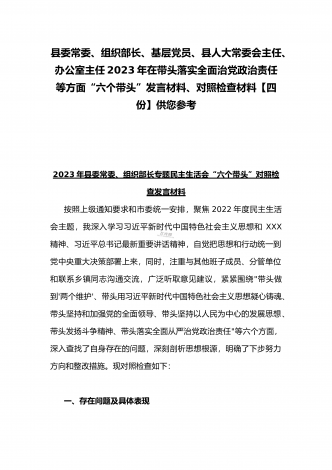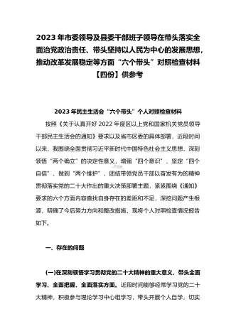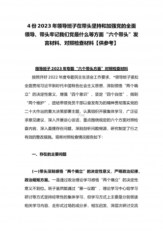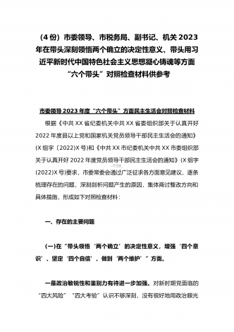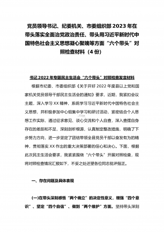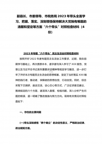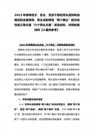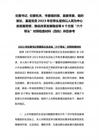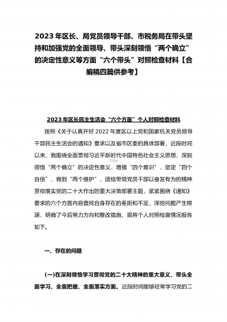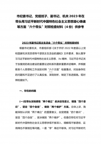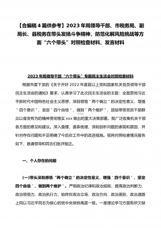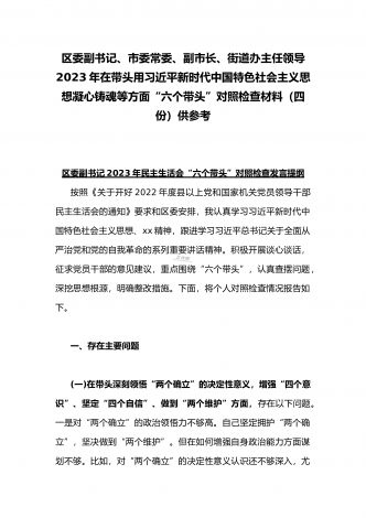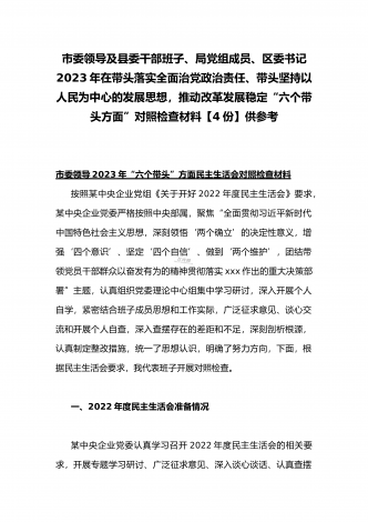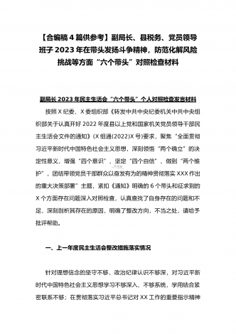 纪委领导干部、党支部书记、班子副职、常委领导班子2023年在带头发扬斗争精神,防范化解风险挑战、带头坚持以人民为中心的发展思想,推动改革发展稳定等方面“六个带头”对照检查材料(4份)2023年纪委领导干部“六个带头”民主生活会个人对照检查材料按照区纪委、区组织部《关于开好2022年度县以上党和国家机关党员领导干部民主生活会的通知》文件建设,我认真研读上级文件要求,主动与班子成员进行了谈心谈话,并紧密结合个人思想、学习和工作实际,采取他人提、自己找、集体议等方式,逐个对照、逐条查找、逐项梳理,找准...