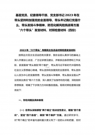 纪委领导干部、党支部书记、班子副职、常委领导班子2023年在带头发扬斗争精神,防范化解风险挑战、带头坚持以人民为中心的发展思想,推动改革发展稳定等方面“六个带头”对照检查材料(4份)