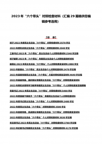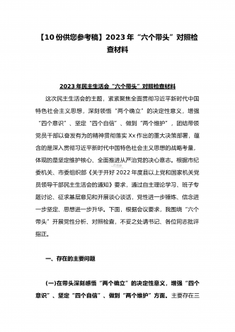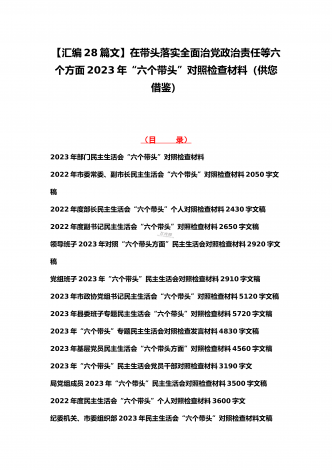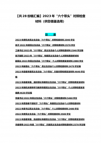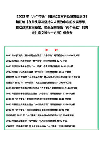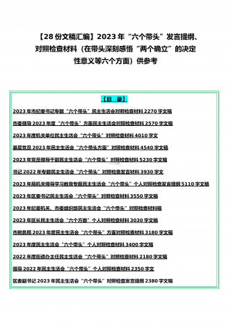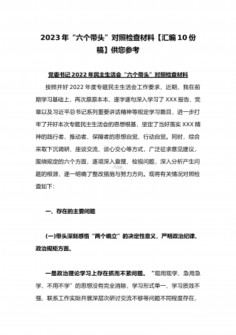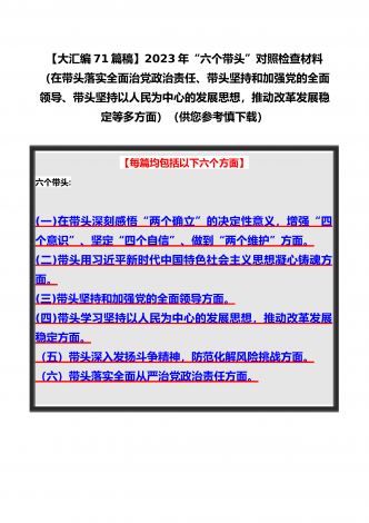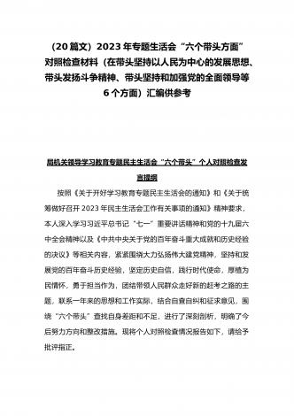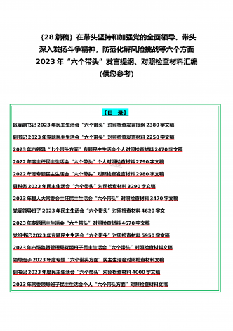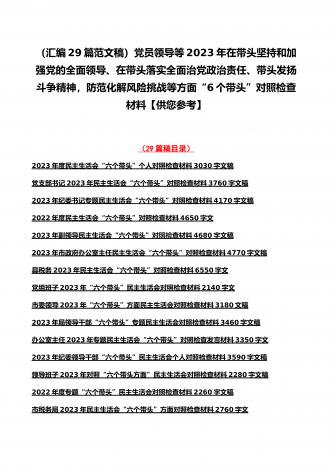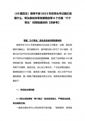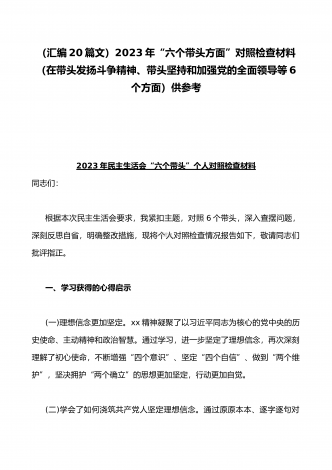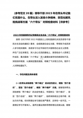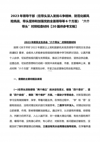 (汇编22份材料)市委机关领导、党组班子、领导干部2023年在带头推动改革发展稳定、在带头深入发扬斗争精神,防范化解风险挑战、在带头坚持和加强党的全面领导等6个方面“六个带头”对照检查材料【供参考】2023年书记民主生活会“六个带头”个人对照检查材料根据会议要求,现将对照检查材料汇报如下:一、认识体会xx胜利召开后,我系统学习了xx精神和习近平新时代中国特色社会主义思想,并充分结合自身实际进行了深入思考。第一,必须增强政治自觉。作为党委负责人,要进一步坚定政治信仰、强化政治担当、锤炼政治品格,自...