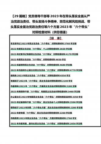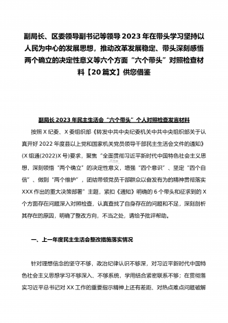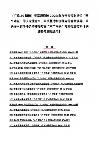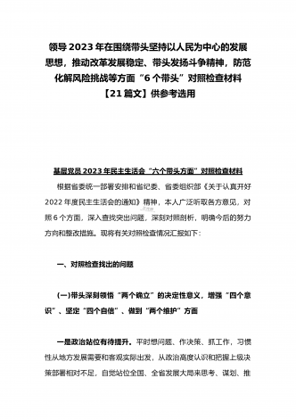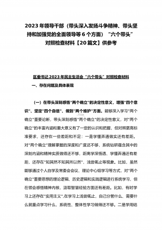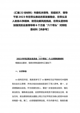(汇编22份材料)市委机关领导、党组班子、领导干部2023年在带头推动改革发展稳定、在带头深入发扬斗争精神,防范化解风险挑战、在带头坚持和加强党的全面领导等6个方面“六个带头”对照检查材料【供参考】