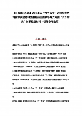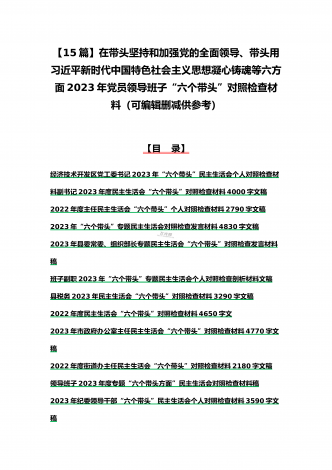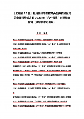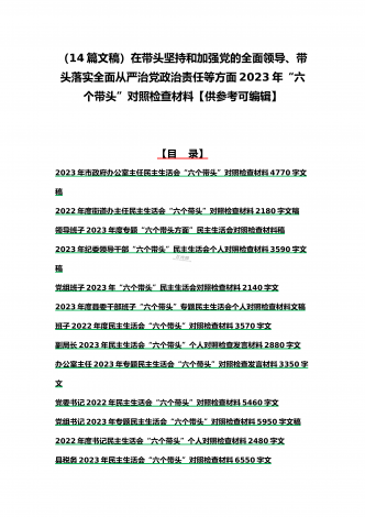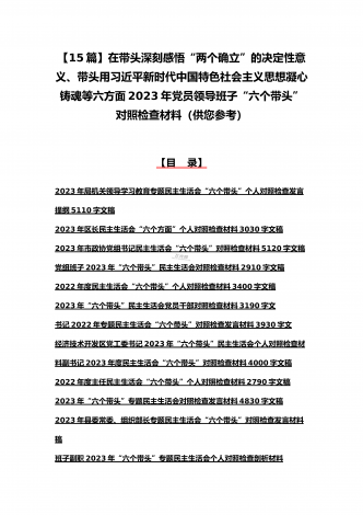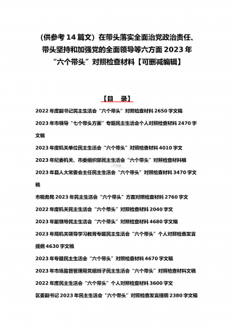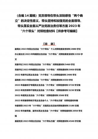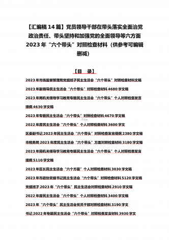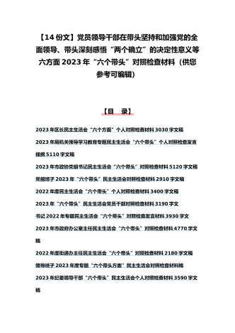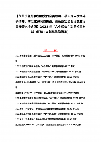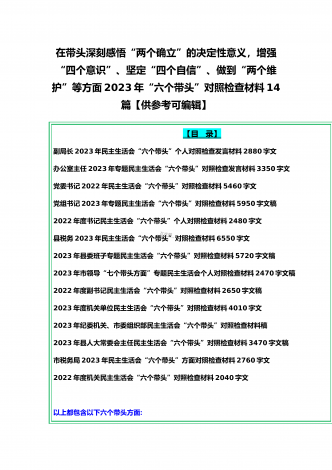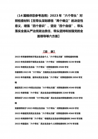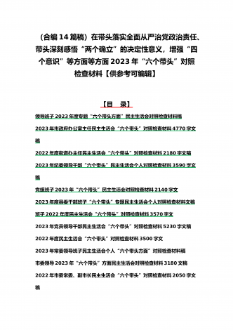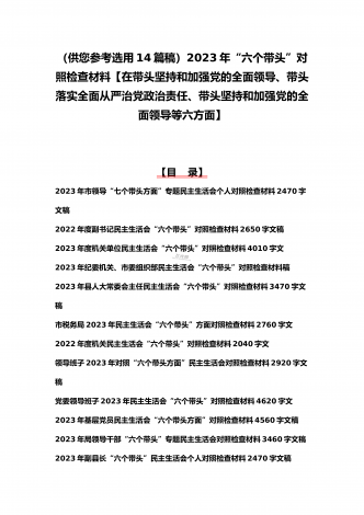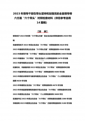 (14篇稿供您参考选用)2023年“六个带头”对照检查材料【在带头深刻感悟“两个确立”的决定性意义,增强“四个意识”、坚定“四个自信”、带头落实全面从严治党政治责任、带头坚持和加强党的全面领导等六方面】