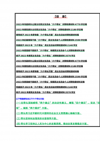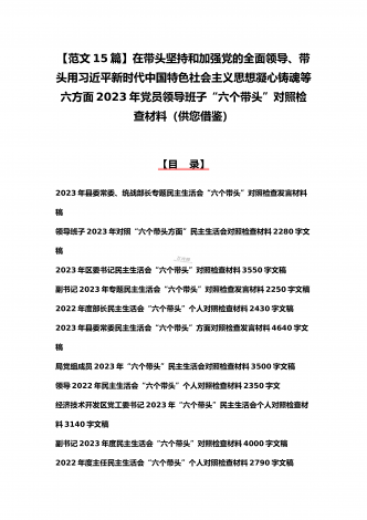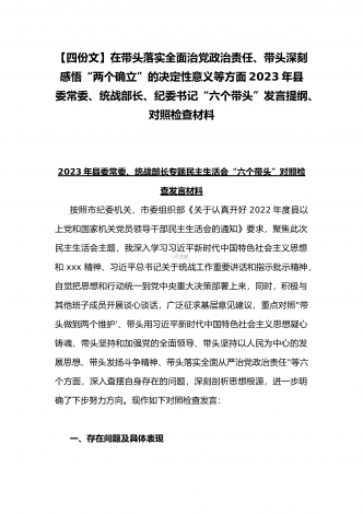 (14篇稿供您参考选用)2023年“六个带头”对照检查材料【在带头深刻感悟“两个确立”的决定性意义,增强“四个意识”、坚定“四个自信”、带头落实全面从严治党政治责任、带头坚持和加强党的全面领导等六方面】【目录】2023年常委领导班子民主生活会个人“六个带头方面”对照检查材料稿2023年党员领导干部民主生活会“六个带头”对照检查材料5230字文稿2022年度民主生活会“六个带头”对照检查材料3500字文市委领导2023年“六个带头”方面民主生活会对照检查材料3180文稿2022年市委常委、副市长民...