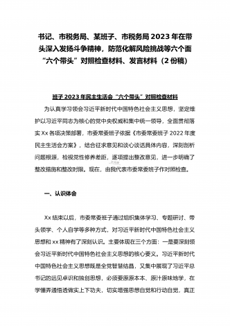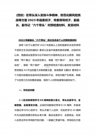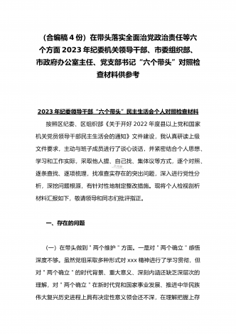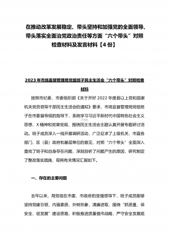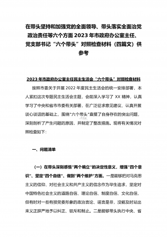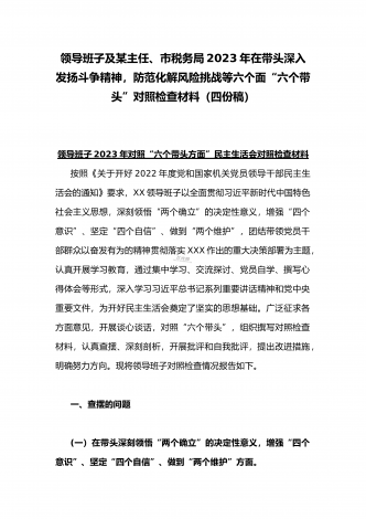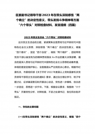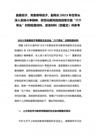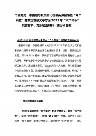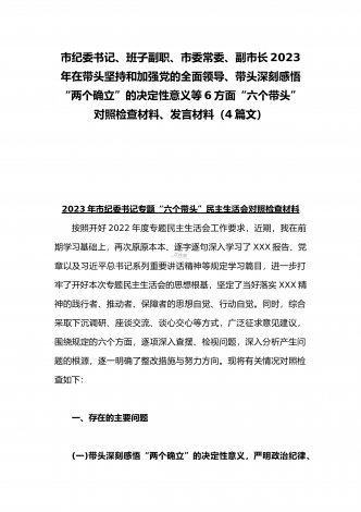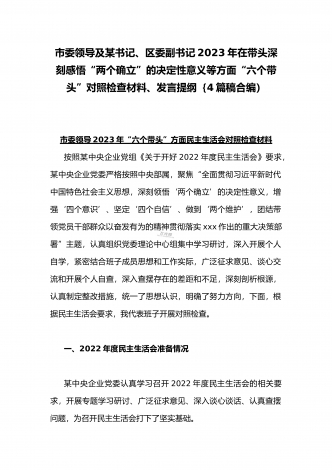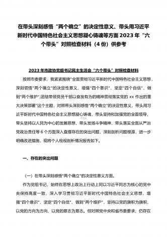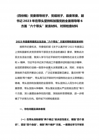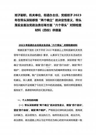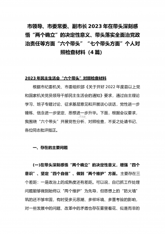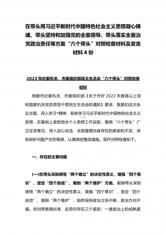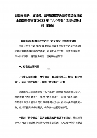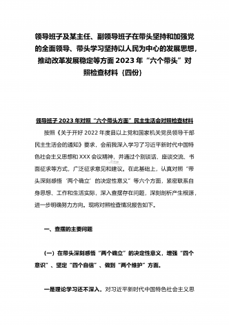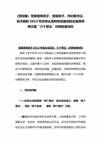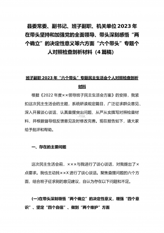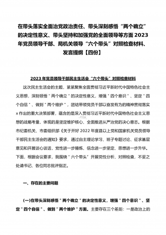 在带头落实全面治党政治责任、带头深刻感悟“两个确立”的决定性意义、带头坚持和加强党的全面领导等方面2023年党员领导干部、局机关领导“六个带头”对照检查材料、发言提纲【四份】2023年党员领导干部民主生活会“六个带头”对照检查材料这次民主生活会的主题,紧紧聚焦全面贯彻习近平新时代中国特色社会主义思想,深刻领悟"两个确立"的决定性意义,增强"四个意识"、坚定"四个自信"、做到"两个维护",团结带领党员干部以奋发有为的精神贯彻落实x作出的重大决策部署,蕴含的是深入贯彻习近平新时代中国特色社会主义思想...