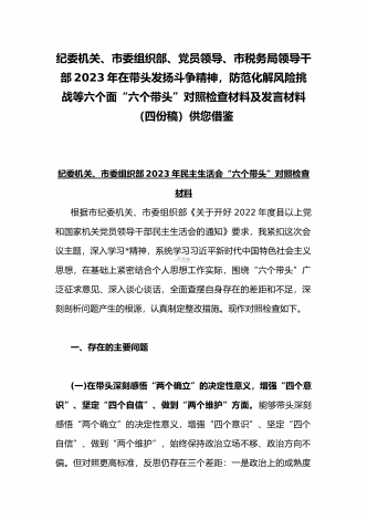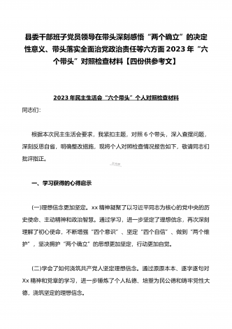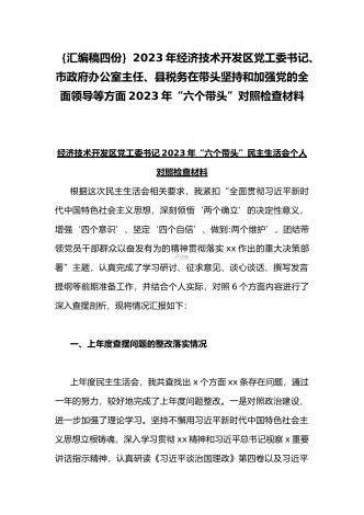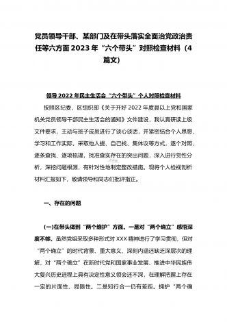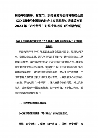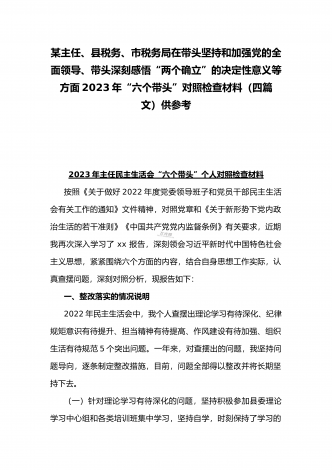 副局长、党委领导班子、班子副职2023年在带头用习近平新时代中国特色社会主义思想凝心铸魂、带头学习坚持以人民为中心的发展思想,推动改革发展稳定等方面“六个带头”发言材料、对照检查材料(四篇文)副局长2023年民主生活会“六个带头”个人对照检查发言材料按照X纪委、X委组织部《转发中共中央纪委机关中共中央组织部关于认真开好2022年度县以上党和国家机关党员领导干部民主生活会文件的通知》(X组通(2022)X号)要求,聚焦“全面贯彻习近平新时代中国特色社会主义思想,深刻领悟“两个确立”的决定性意义,增...