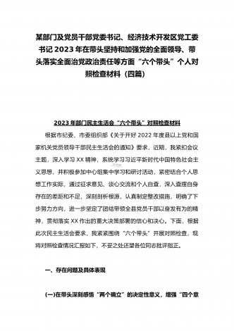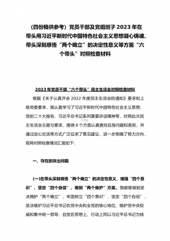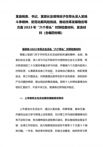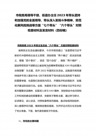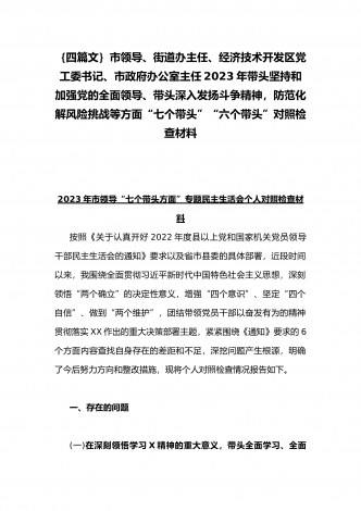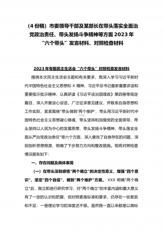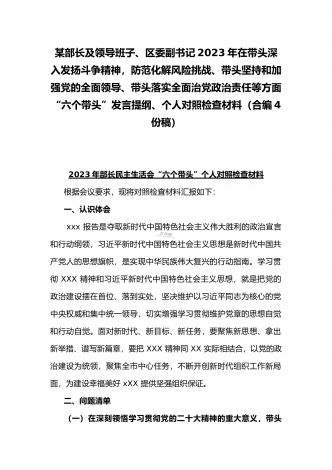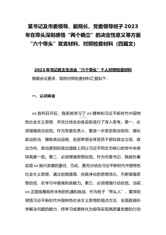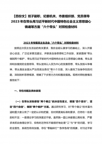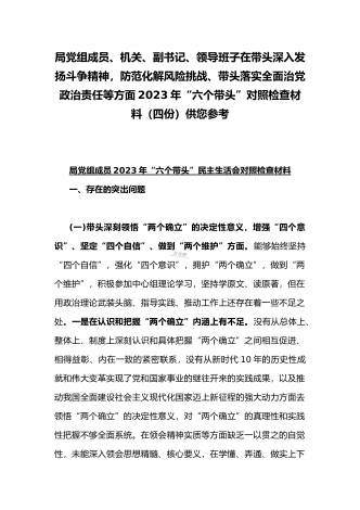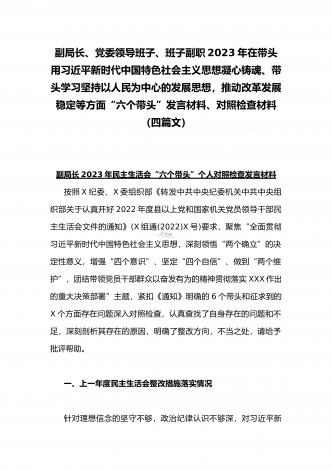 副局长、党委领导班子、班子副职2023年在带头用习近平新时代中国特色社会主义思想凝心铸魂、带头学习坚持以人民为中心的发展思想,推动改革发展稳定等方面“六个带头”发言材料、对照检查材料(四篇文)