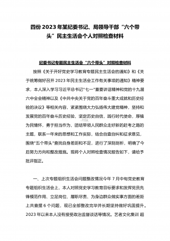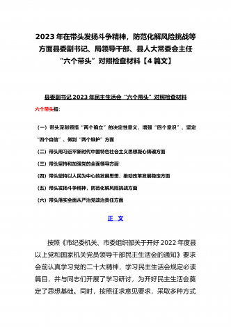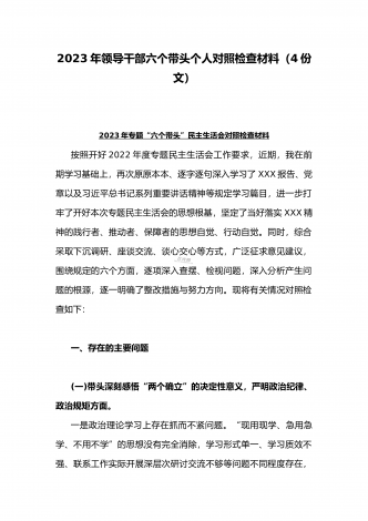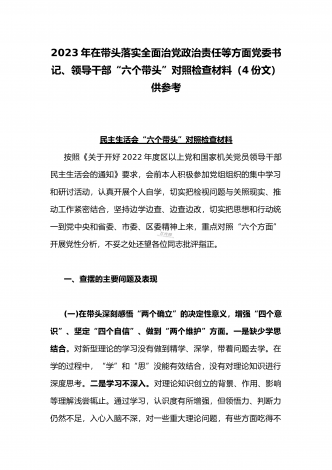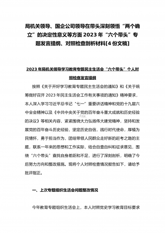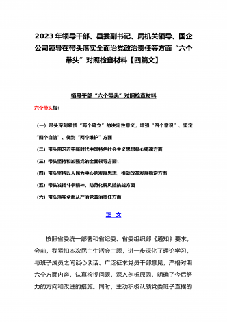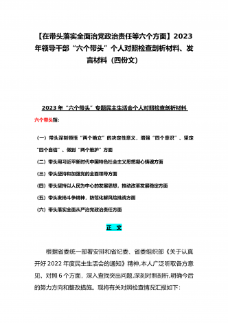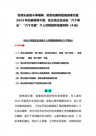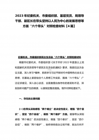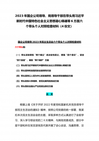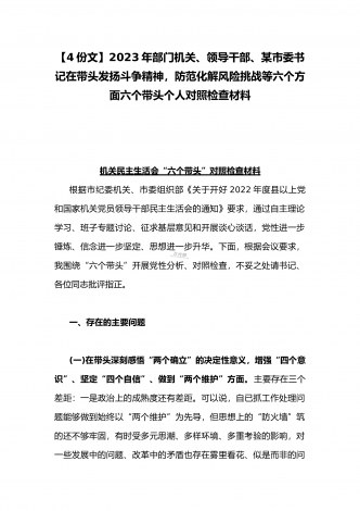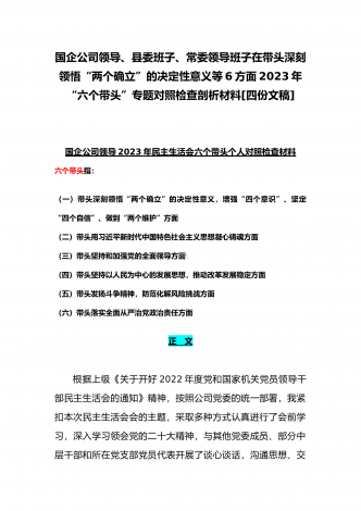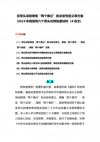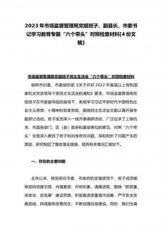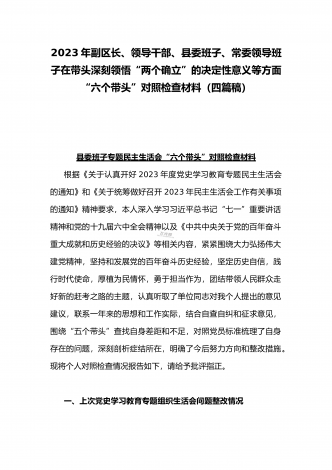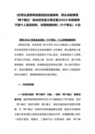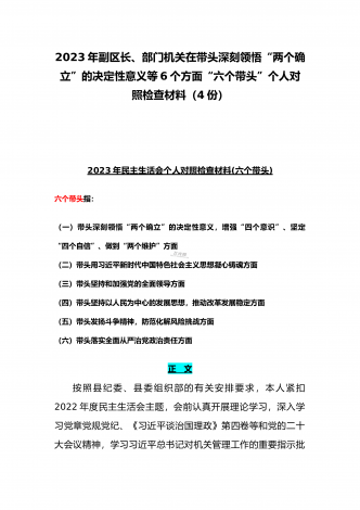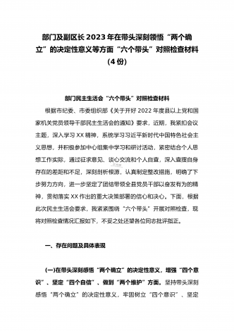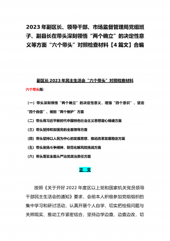 2023年副区长、领导干部、市场监督管理局党组班子、副县长在带头深刻领悟“两个确立”的决定性意义等方面“六个带头”对照检查材料【4篇文】合编