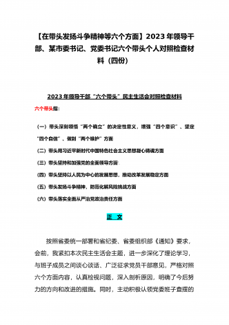 2023年副区长、领导干部、市场监督管理局党组班子、副县长在带头深刻领悟“两个确立”的决定性意义等方面“六个带头”对照检查材料【4篇文】合编副区长2023年民主生活会“六个带头”对照检查材料六个带头指:(一)带头深刻领悟“两个确立”的决定性意义,增强“四个意识”、坚定“四个自信”、做到“两个维护”方面(二)带头用习近平新时代中国特色社会主义思想凝心铸魂方面(三)带头坚持和加强党的全面领导方面(四)带头坚持以人民为中心的发展思想,推动改革发展稳定方面(五)带头发扬斗争精神,防范化解风险挑战方面(六...