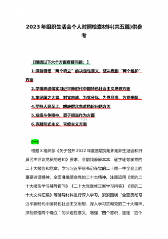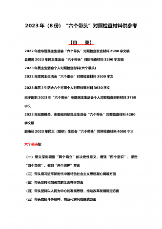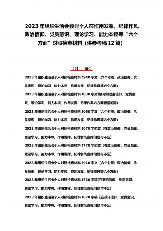 司法局、医院党员、党支部干部、新疆基层党员2023年组织生活会在政治信仰、党员意识等“六个方面”对照检查材料、“六个带头”存在问题努力方向整改措施原因剖析分析(12篇)汇编【目录】司法局党员干部2023年组织生活会“六个方面”个人对照检查材料稿司法局党员干部2023年组织生活会“六个方面”个人对照检查材料文稿普通党员2023年组织生活会六个对照检查材料3640字文稿医院党支部党员干部2023年组织生活会六个对照个人对照检查材料3100字文(六个对照在政治信仰党员意识理论学习能力本领作用发挥纪律作...