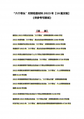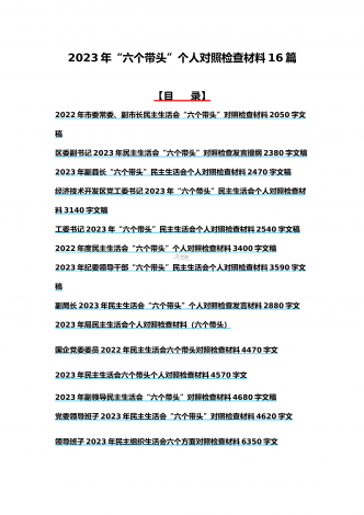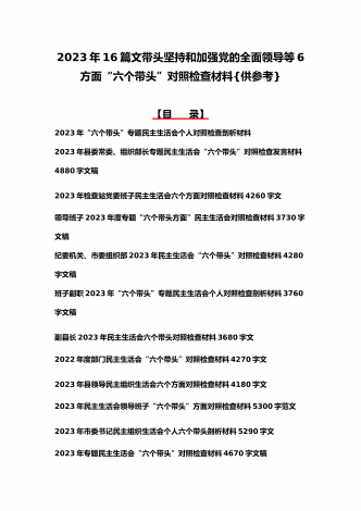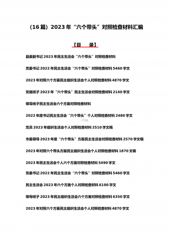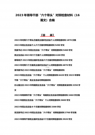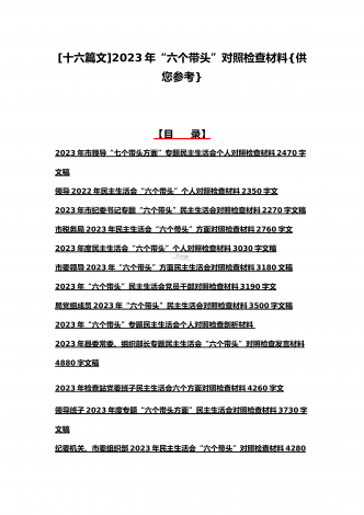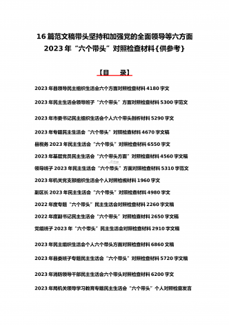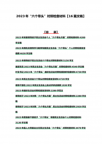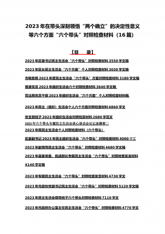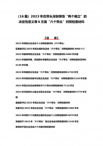 2023年在带头深刻领悟“两个确立”的决定性意义等六个方面“六个带头”对照检查材料(16篇)【目录】2023年区委书记民主生活会“六个带头”对照检查材料3550字文稿2023年区长民主生活会“六个方面”个人对照检查材料3030字文稿市税务局2023年度民主生活会“六个带头”方面对照检查材料3180字文稿普通党员2023年组织生活会六个对照检查材料3640字文稿司法局党员干部2023年组织生活会“六个方面”个人对照检查材料稿2023年民主(组织)生活会个人六个方面对照检查材料6860字文党支部班子...