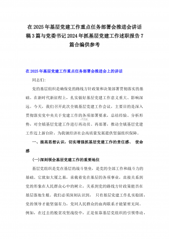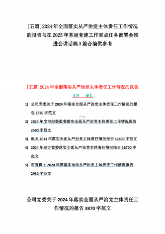[五篇]2024年全面落实从严治党主体责任工作情况的报告与在2025年基层党建工作重点任务部署会推进会讲话稿3篇合编供参考