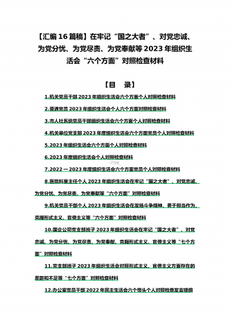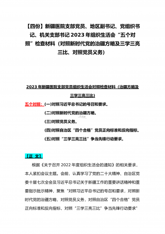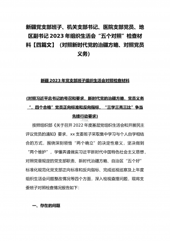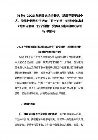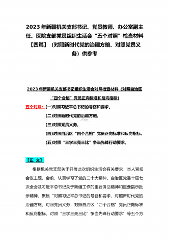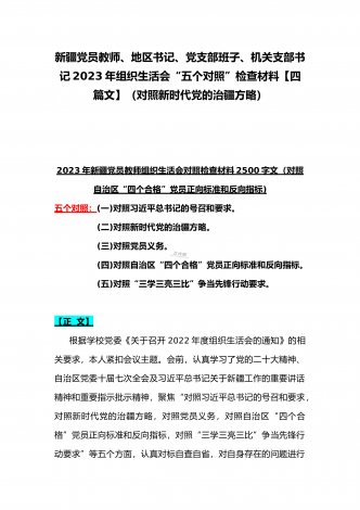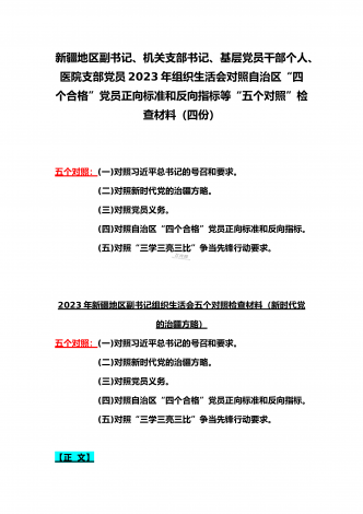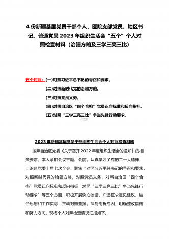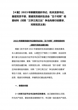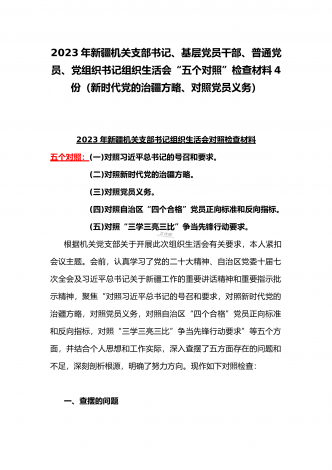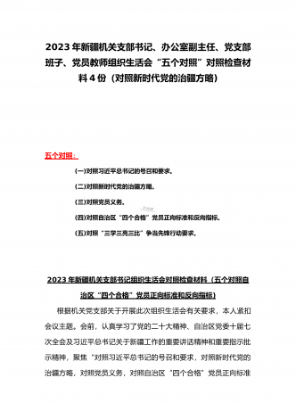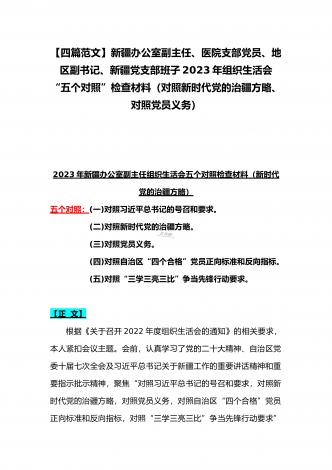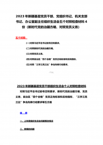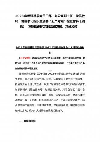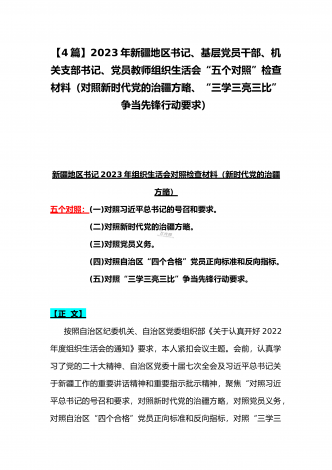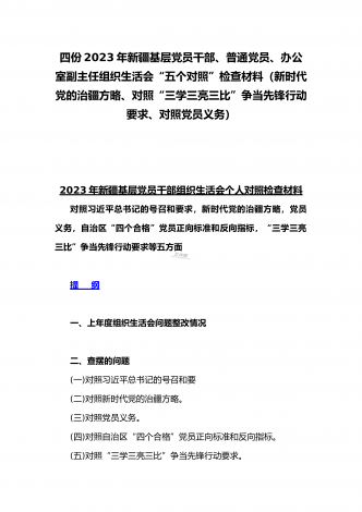 四份2023年新疆基层党员干部、普通党员、办公室副主任组织生活会“五个对照”检查材料(新时代党的治疆方略、对照“三学三亮三比”争当先锋行动要求、对照党员义务)2023年新疆基层党员干部组织生活会个人对照检查材料对照习近平总书记的号召和要求,新时代党的治疆方略,党员义务,自治区“四个合格”党员正向标准和反向指标,“三学三亮三比”争当先锋行动要求等五方面提纲一、上年度组织生活会问题整改情况二、查摆的问题(一)对照习近平总书记的号召和要(二)对照新时代党的治疆方略。(三)对照党员义务。(四)对照自治区...