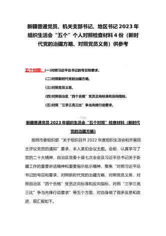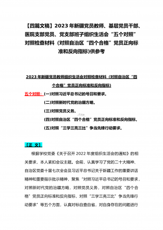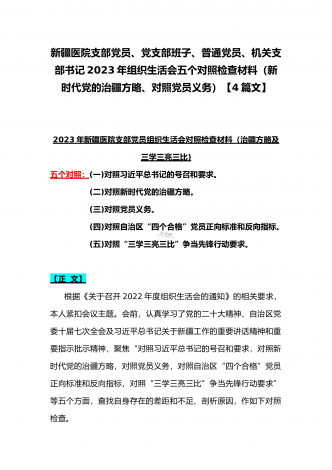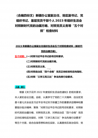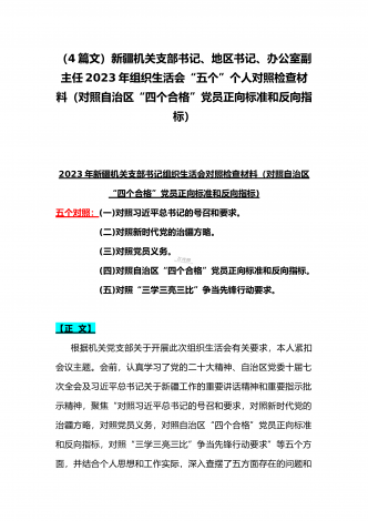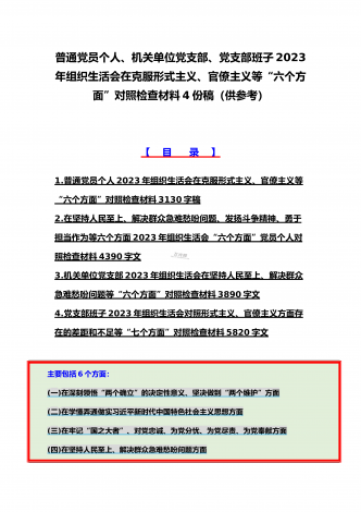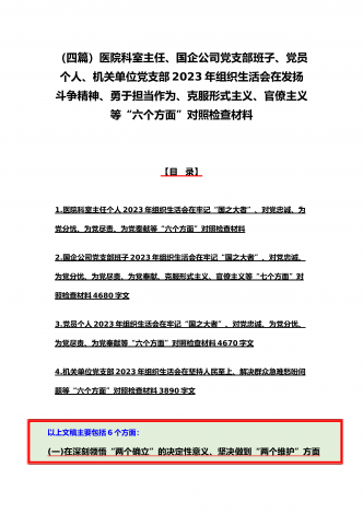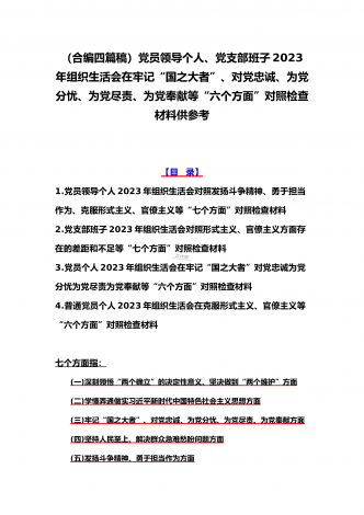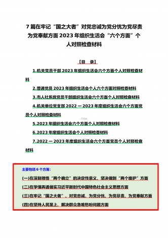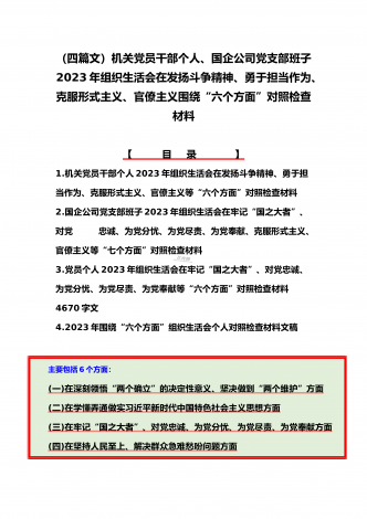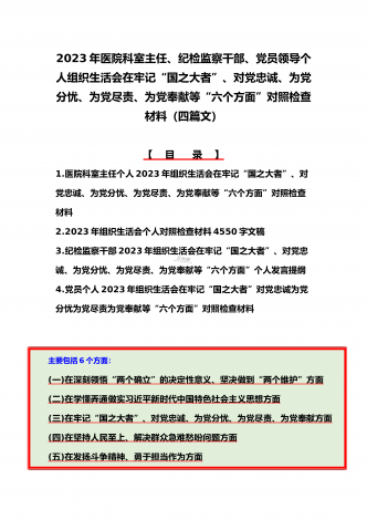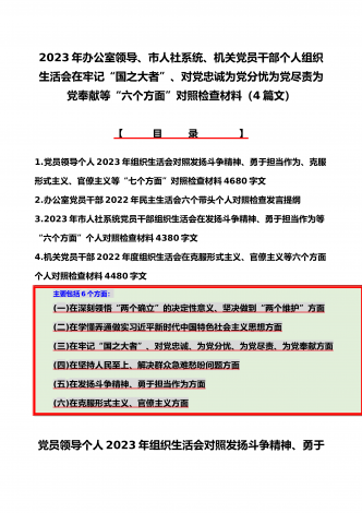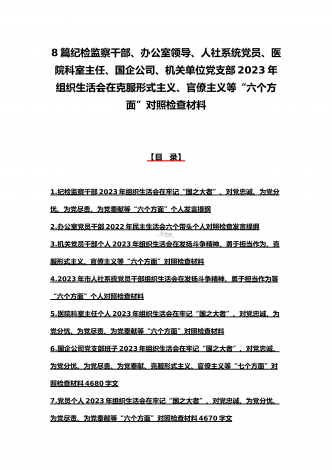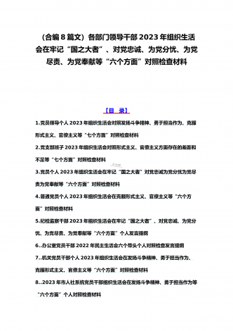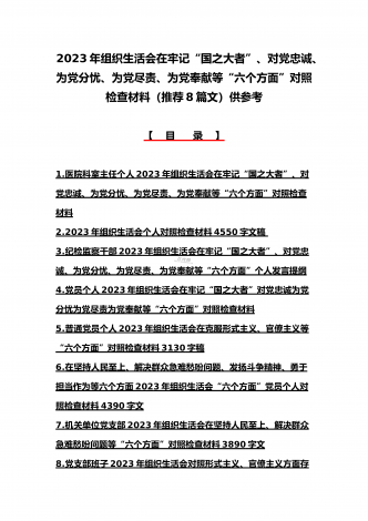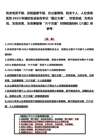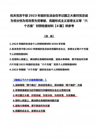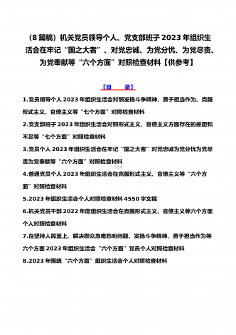 机关党员干部、纪检监察干部、办公室领导、机关个人、人社系统党员2023年组织生活会在牢记“国之大者”、对党忠诚、为党分忧、为党尽责、为党奉献等“六个方面”对照检查材料【八篇】供参考【目录】1.2023年组织生活会个人对照检查材料4550字文稿2.机关党员干部2022年组织生活会在克服形式主义、官僚主义等六个方面个人对照检查材料3.在坚持人民至上、解决群众急难愁吩问题、发扬斗争精神、勇于担当作为等六个方面2023年组织生活会“六个方面”党员个人对照检查材料4.2023年围绕“六个方面”组织生活会个...