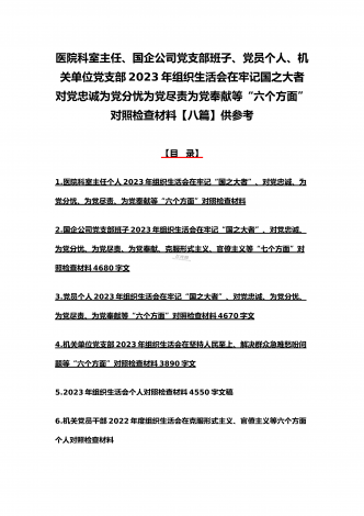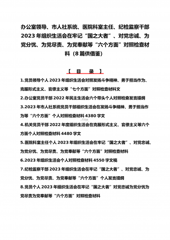 机关党员干部、纪检监察干部、办公室领导、机关个人、人社系统党员2023年组织生活会在牢记“国之大者”、对党忠诚、为党分忧、为党尽责、为党奉献等“六个方面”对照检查材料【八篇】供参考