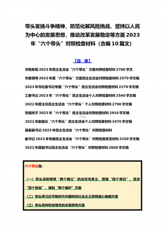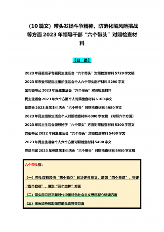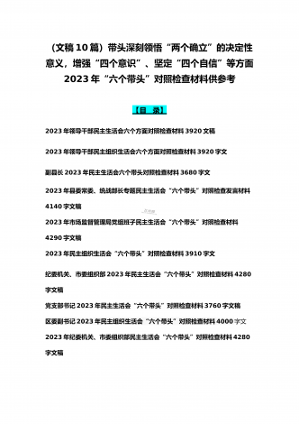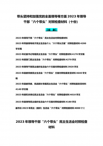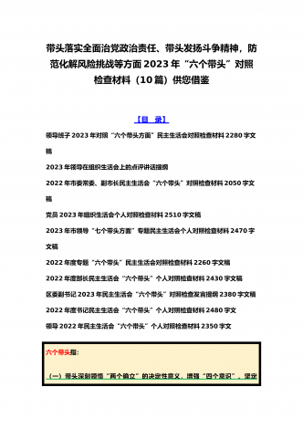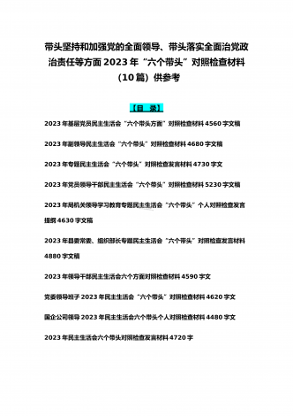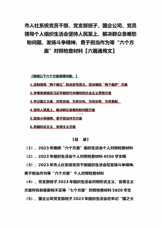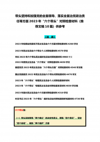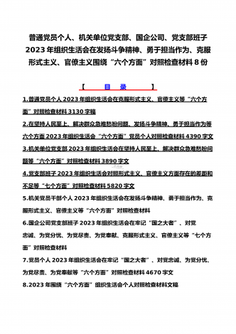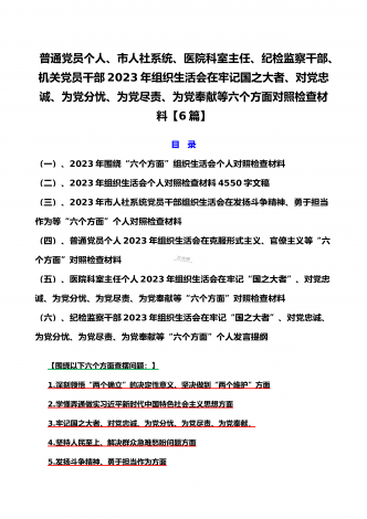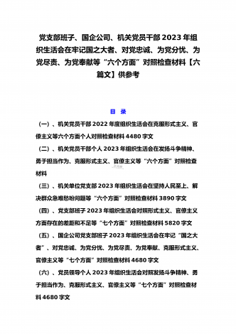 普通党员、医院科室主任个人、纪检监察干部、机关党员干部2023年组织生活会在牢记“国之大者”、对党忠诚、为党分忧、为党尽责、为党奉献等“六个方面”对照检查材料【6篇推荐文稿汇编】目录(一)、普通党员个人2023年组织生活会在克服形式主义、官僚主义等“六个方面”对照检查材料(二)、医院科室主任个人2023年组织生活会在牢记“国之大者”、对党忠诚、为党分忧、为党尽责、为党奉献等“六个方面”对照检查材料(三)、纪检监察干部2023年组织生活会在牢记“国之大者”、对党忠诚、为党分忧、为党尽责、为党奉献等...