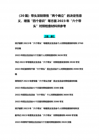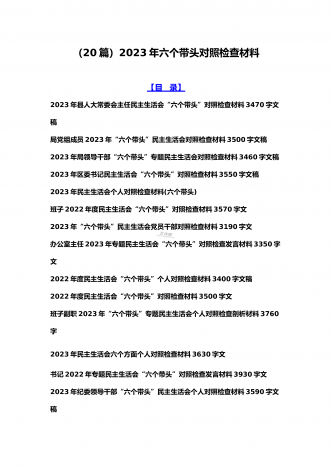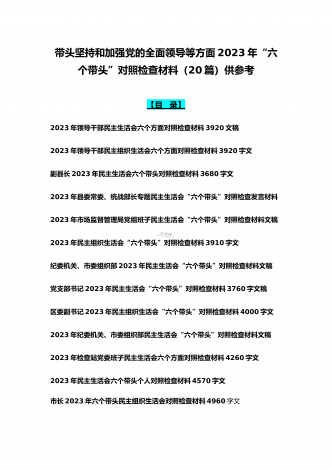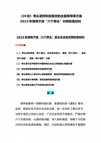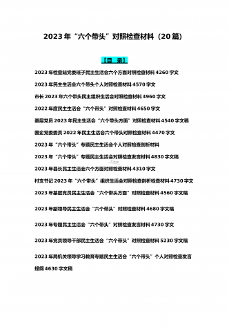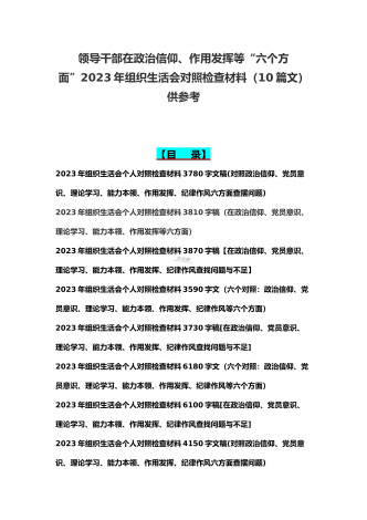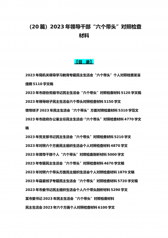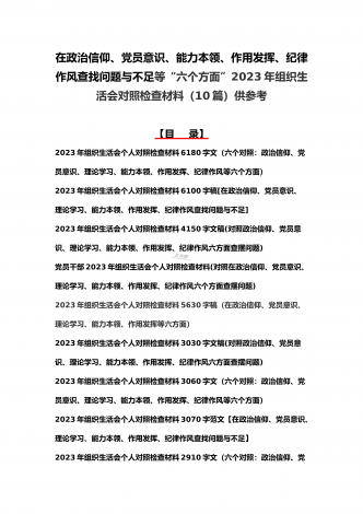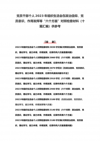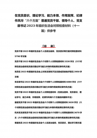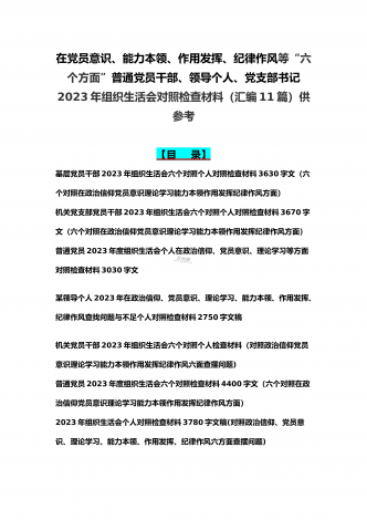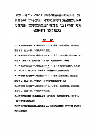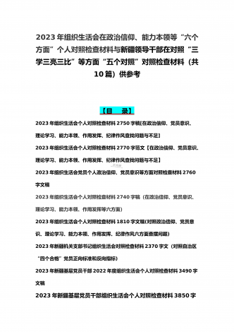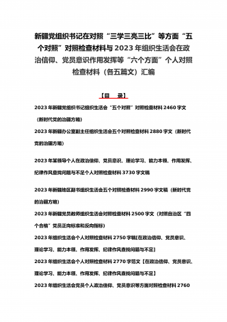 新疆领导干部在对照“三学三亮三比”等“五个对照”与普通党员干部、医院党支部领导2023年组织生活会在党员意识、纪律作风等“六个方面”对照检查材料(共11篇供您参考)【目录】2023年新疆机关支部书记组织生活会对照检查材料2370字文(对照自治区“四个合格”党员正向标准和反向指标)2023年新疆基层党员干部2022年度组织生活会个人对照检查材料3490字文稿2023年新疆基层党员干部组织生活会个人对照检查材料3850字文2023年新疆医院支部党员组织生活会对照检查材料1750字文稿(治疆方略及三学...