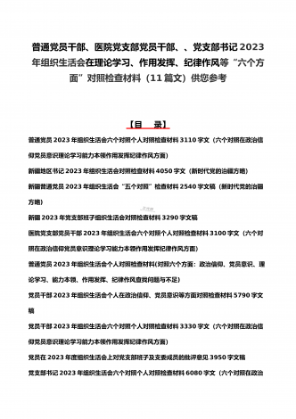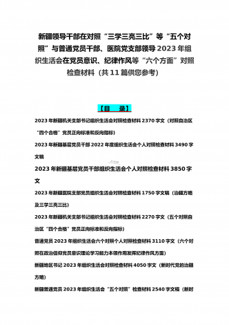 新疆领导干部在对照“三学三亮三比”等“五个对照”与普通党员干部、医院党支部领导2023年组织生活会在党员意识、纪律作风等“六个方面”对照检查材料(共11篇供您参考)