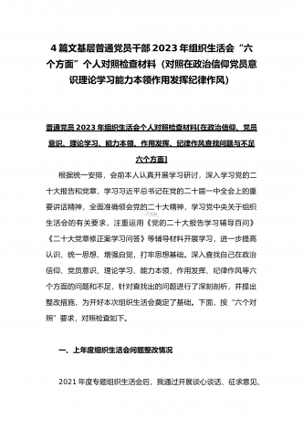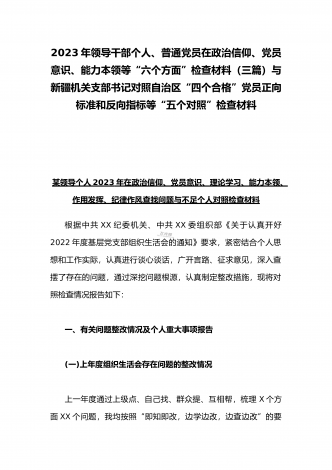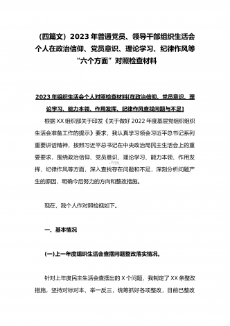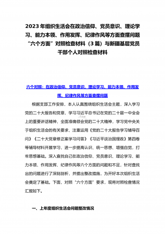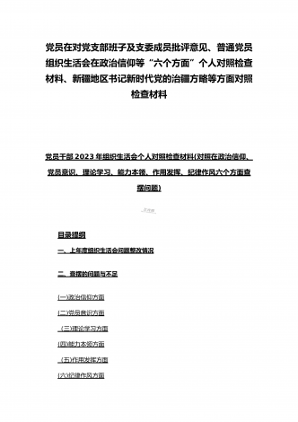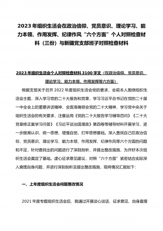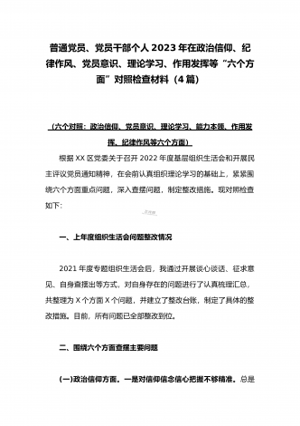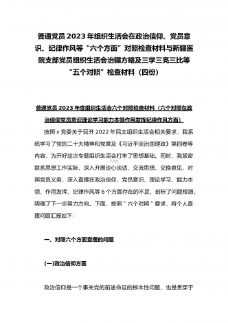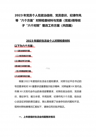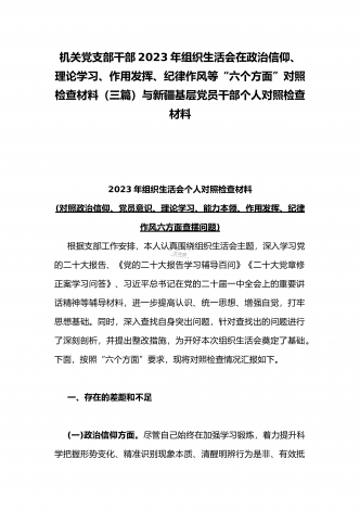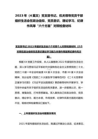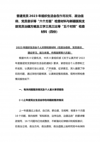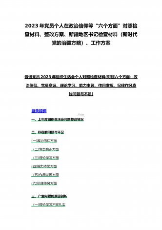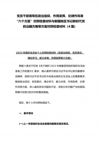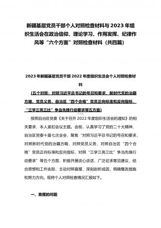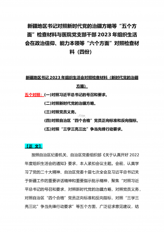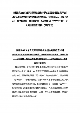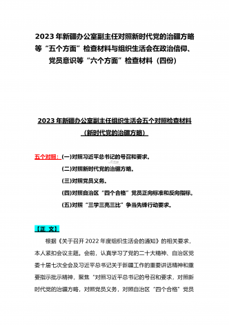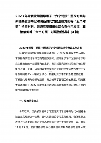 2023年党委党组领导班子“六个对照”整改方案与新疆关支部书记对照新时代党的治疆方略等“五个对照”检查材料、普通党员组织生活会在作用发挥、政治信仰等“六个方面”对照检查材料(4篇)