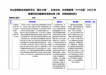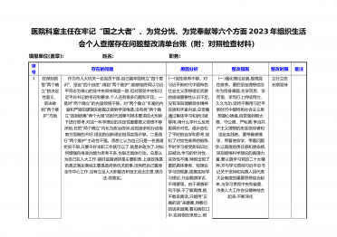 在牢记“国之大者”、对党忠诚、为党分忧、为党尽责、为党奉献方面2023年党员干部组织生活会个人查摆存在问题整改清单台账【附:对照检查材料】填报单位(盖章):姓名:职务:序号存在的问题原因分析整改措施整改时限备注1在深刻领悟"两个确立"的决定性意义、坚决做到"两个维护"方面作为市人大机关一名党员干部,自己能牢固树立"四个意识"、坚定"四个自信",做到"两个维护",能够始终同以习近平同志为核心的党中央保持高度一致,但对照党中央和习近平总书记的号召和要求,个人还有很多问题和不足。一是对"两个确立"的内...