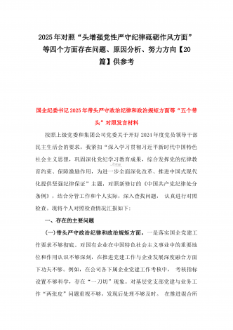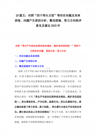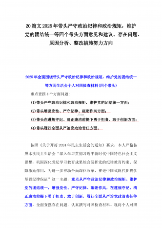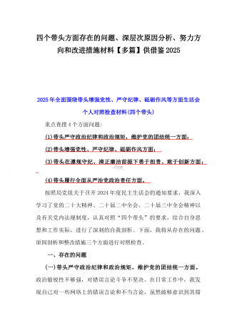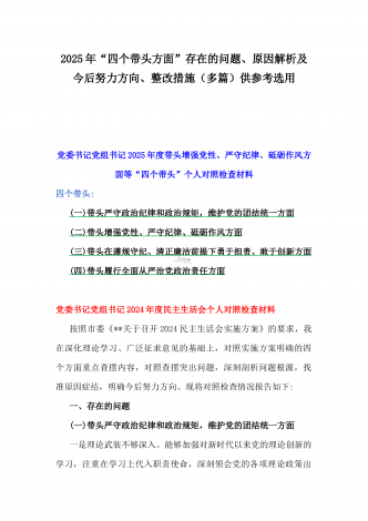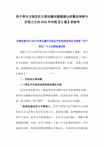 2025年带头严守政治纪律和政治规矩,维护党的结统一等“四个带头”存在问题、原因剖析及整改措施、下步努力方向(多篇文)汇编供参考乡镇长2025年带头增强党性、严守纪律、砥砺作风方面等“四个带头”个人对照检查发言材料按照《关于认真开好2024年度民主生活会的通知》要求,本人深入学习贯彻习近平新时代中国特色社会主义思想和党的二十届三中全会精神,对标对表党中央决策部署和省委、市委、县委工作要求,深刻检视反思自身存在的问题和不足,现将个人对照检查情况汇报如下。一、存在的主要问题(一)带头严守政治纪律和政...