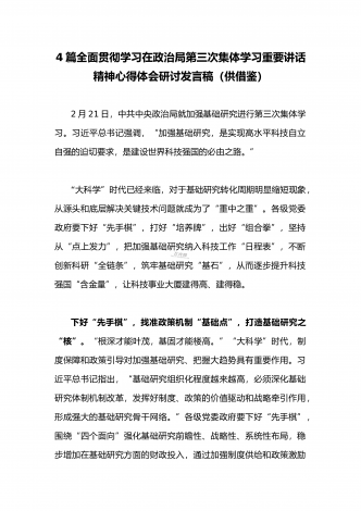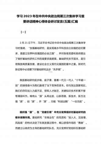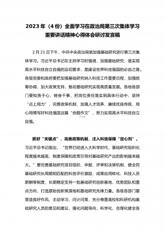 2023年党员领导在中共中央政治局第三次集体学习重要讲话精神学习心得体会研讨材料(四篇文)2月21日下午,中共中央政治局就加强基础研究进行第三次集体学习。习近平总书记在主持学习时强调,加强基础研究,是实现高水平科技自立自强的迫切要求,是建设世界科技强国的必由之路。各级党委和政府要把加强基础研究纳入科技工作重要日程,加强统筹协调,加大政策支持,推动基础研究实现高质量发展。各地各部门要知责于心、俯身千事,把岗位责任落实到具体行动中,坚持“点上用力”,完善政策机制、加强人才培养、赓续优良传统,用心用情...