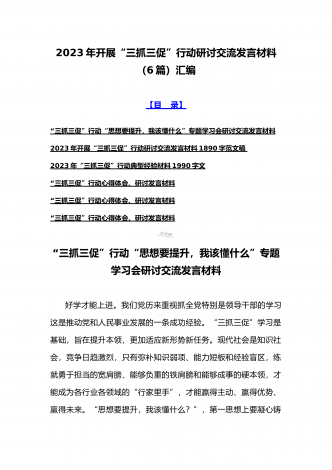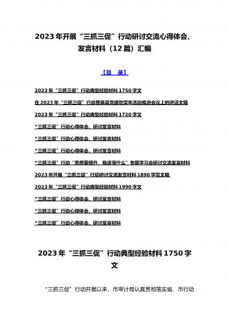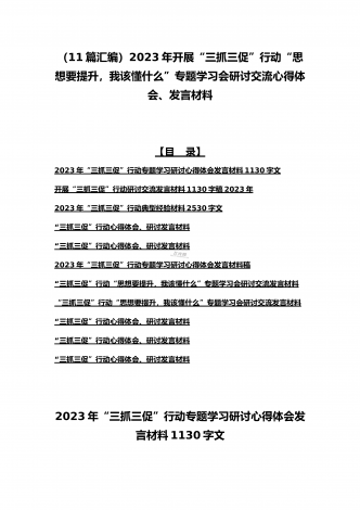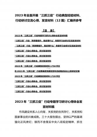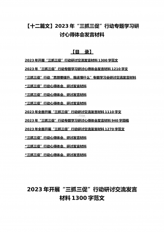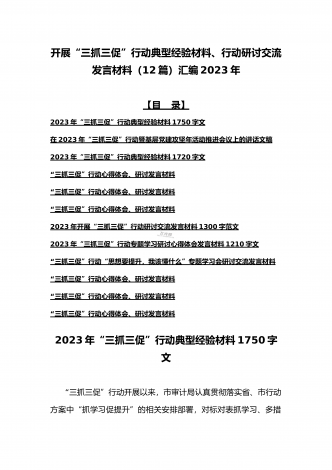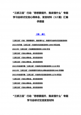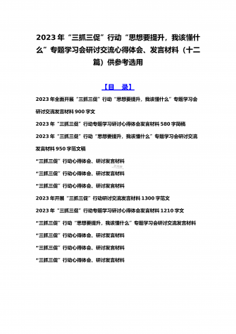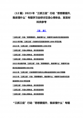 2023年“三抓三促”行动“思想要提升,我该懂什么”专题学习会研讨交流心得体会、发言材料(十二篇)供参考选用【目录】2023年全面开展“三抓三促”行动“思想要提升,我该懂什么”专题学习会研讨交流发言材料900字文2023年“三抓三促”行动专题学习研讨心得体会发言材料580字简稿2023年“三抓三促”行动“思想要提升,我该懂什么”专题学习会研讨交流发言材料950字范文稿“三抓三促”行动心得体会、研讨发言材料“三抓三促”行动心得体会、研讨发言材料“三抓三促”行动心得体会、研讨发言材料2023年开展“...