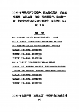 2023年开展抓学习促提升、抓执行促落实、抓效能促发展“三抓三促”行动“思想要提升,我该懂什么”专题学习会研讨交流心得体会、发言材料(12篇)汇编【目录】2023年全面开展“三抓三促”行动研讨交流发言材料1110字文2023年“三抓三促”行动专题学习研讨心得体会发言材料940字简稿2023年全面开展“三抓三促”行动研讨交流发言材料1270字范文“三抓三促”行动心得体会、研讨发言材料“三抓三促”行动心得体会、研讨发言材料“三抓三促”行动心得体会、研讨发言材料2023年“三抓三促”行动专题学习研讨心...