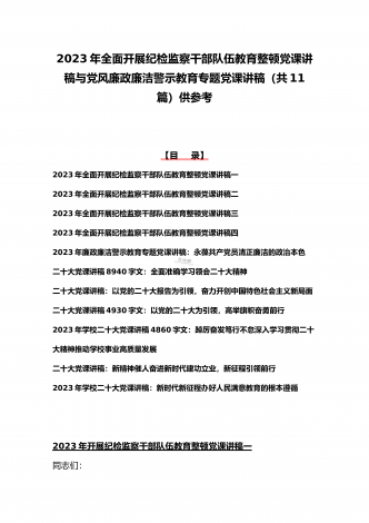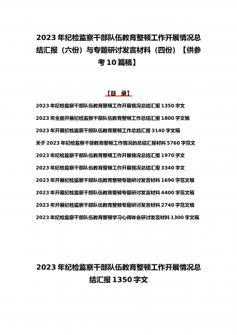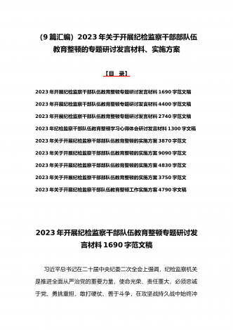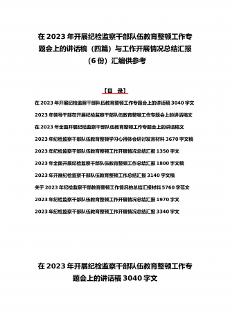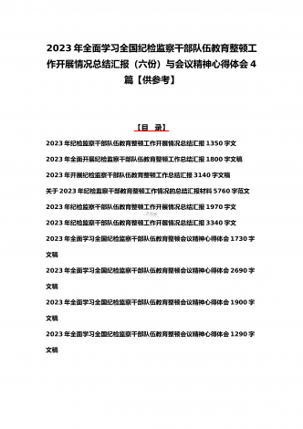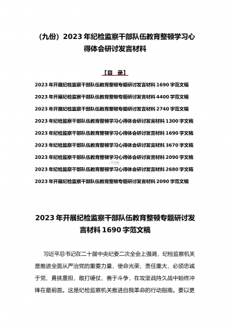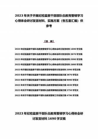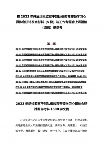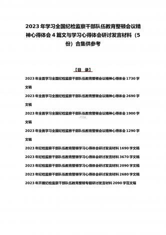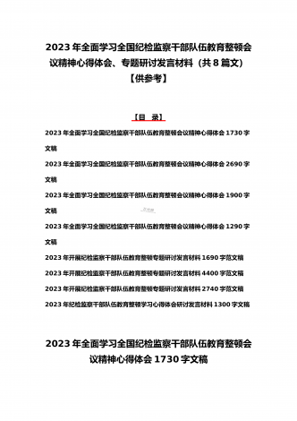 2023年学习全国纪检监察干部队伍教育整顿会议精神心得体会4篇文与学习心得体会研讨发言材料(5份)合集供参考【目录】2023年全面学习全国纪检监察干部队伍教育整顿会议精神心得体会1730字文稿2023年全面学习全国纪检监察干部队伍教育整顿会议精神心得体会2690字文稿2023年全面学习全国纪检监察干部队伍教育整顿会议精神心得体会1900字文稿2023年全面学习全国纪检监察干部队伍教育整顿会议精神心得体会1290字文稿2023年纪检监察干部队伍教育整顿学习心得体会研讨发言材料1690字文稿2023...