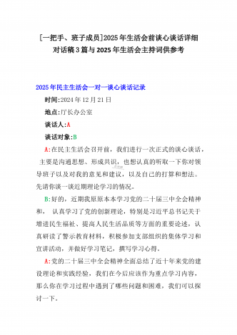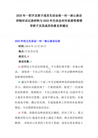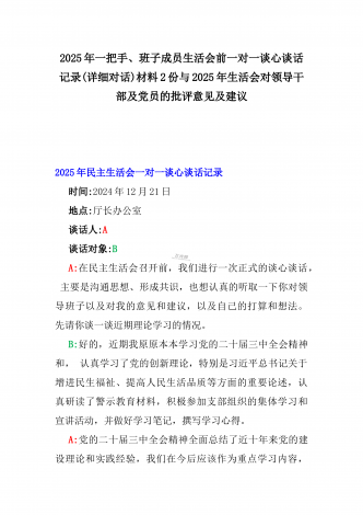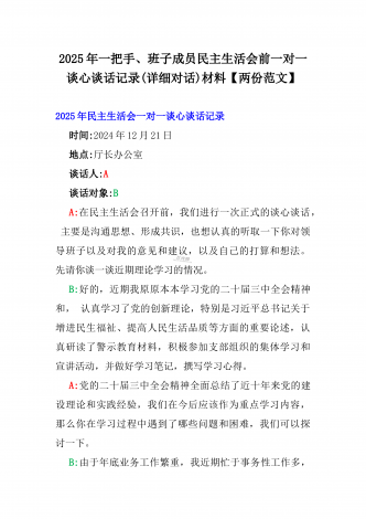 2025年一把手及领导班子成员生活会前一对一谈心谈话详细对话记录材料与2025年带头严守政治纪律和政治规矩,维护党的团结统一等“四个带头方面”实施方案2025年一把手及领导班子成员民主生活会前一对一谈心谈话详细对话记录材料时间:2024年12月21日地点:厅长办公室谈话人:A谈话对象:BA:党员谈心活动开好民主生活会的重要一环,我们必须从思想上重视。今天我以一名普通党员的身份和你一起交流思想、聊聊天,请不要拘束,工作、学习、生活各方面都可以谈。B:好的。通过近期对党的二十届三中全会精神和党的创新...