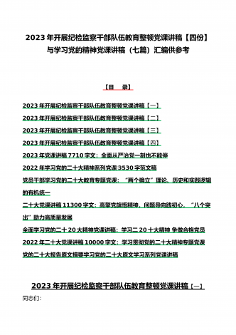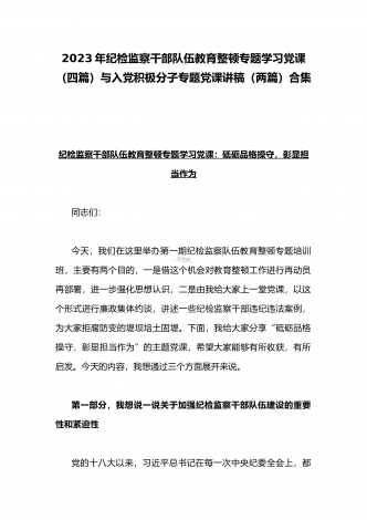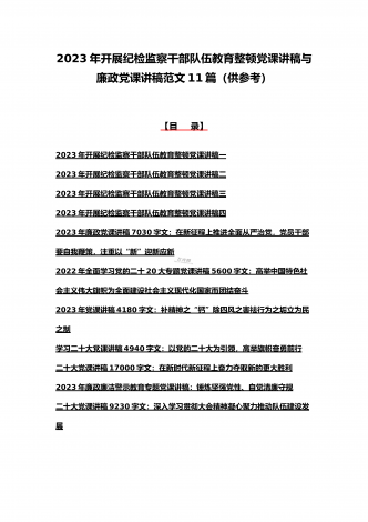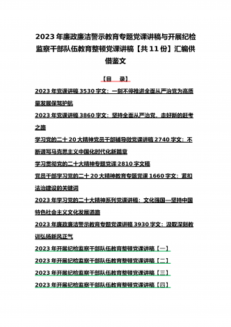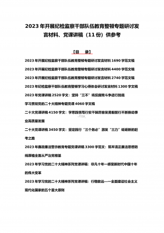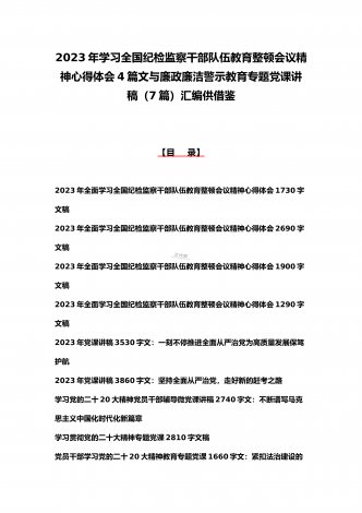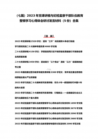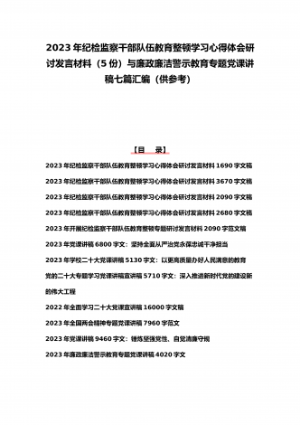 2023年纪检监察干部队伍教育整顿学习心得体会研讨发言材料(5份)与廉政廉洁警示教育专题党课讲稿七篇汇编(供参考)【目录】2023年纪检监察干部队伍教育整顿学习心得体会研讨发言材料1690字文稿2023年纪检监察干部队伍教育整顿学习心得体会研讨发言材料3670字文稿2023年纪检监察干部队伍教育整顿学习心得体会研讨发言材料2090字文稿2023年纪检监察干部队伍教育整顿学习心得体会研讨发言材料2680字文稿2023年开展纪检监察干部队伍教育整顿专题研讨发言材料2090字范文稿2023年党课讲稿6...