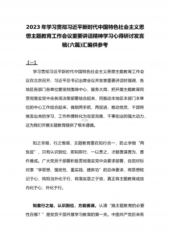 2023年学习贯彻习近平新时代中国特色社会主义思想主题教育工作会议重要讲话精神学习心得研讨发言稿(六篇)汇编供参考