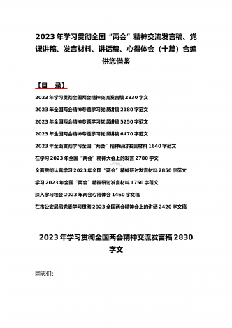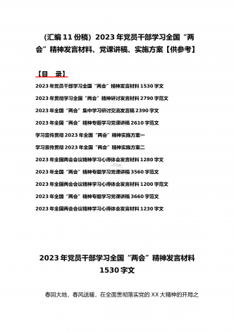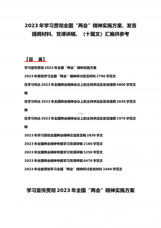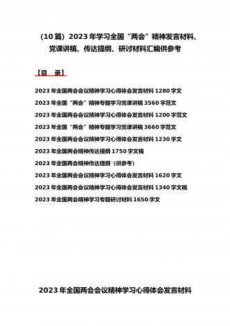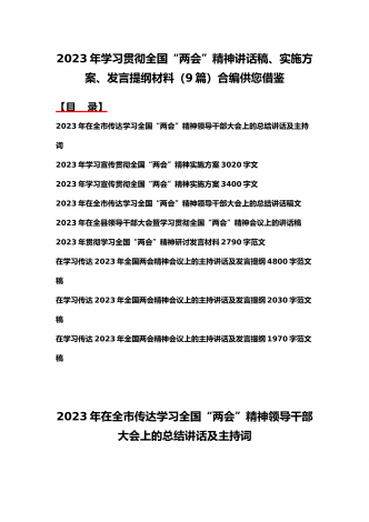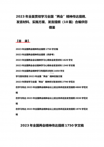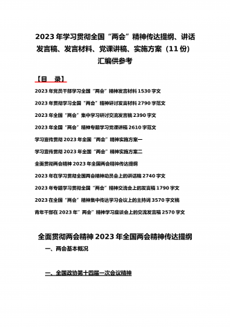 2023年学习贯彻全国“两会”精神传达提纲、讲话发言稿、发言材料、党课讲稿、实施方案(11份)汇编供参考