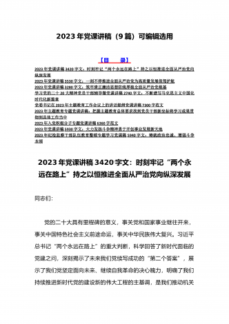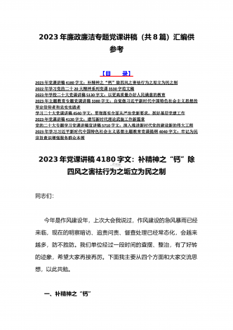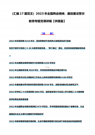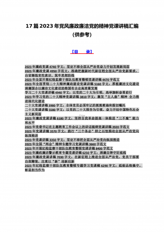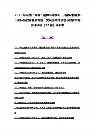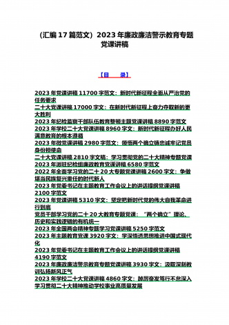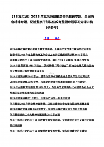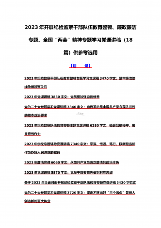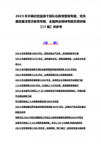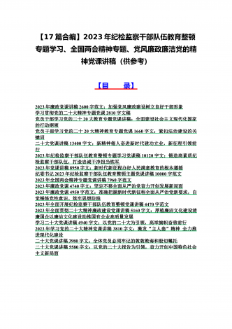 (17篇汇编)2023年全面开展纪检监察干部队伍教育整顿、大兴调查研究专题、廉政廉洁警示教育专题党课讲稿【可编辑选用】【目录】2023年教育整顿专题党课讲稿:扎实开展教育整顿打造忠诚干净担当的纪检监察铁军2022年全面学习党的二十20大专题党课讲稿3030字文:发扬自我革命与敢于斗争精神,在新征程上展现新担当2023年学校开展学习二十大精神专题党课讲稿7340字范文:学深、悟透、笃行,以新担当新作为办好人民满意的教育党的二十大专题学习党课讲稿宣讲稿2860字文:坚定不移走好“五个必由之路”二十大...