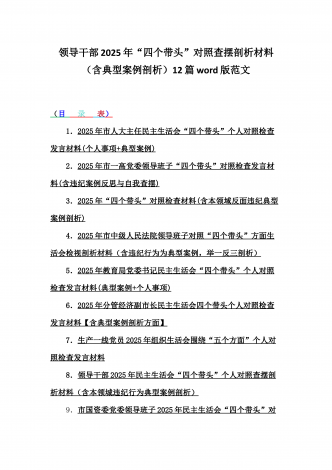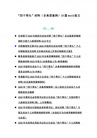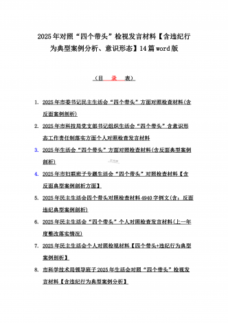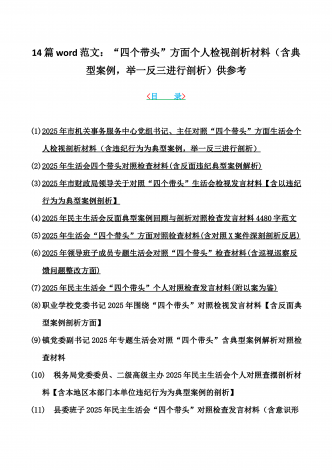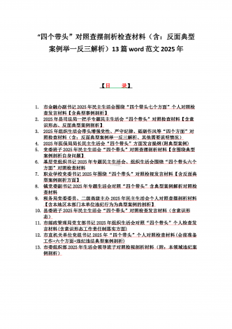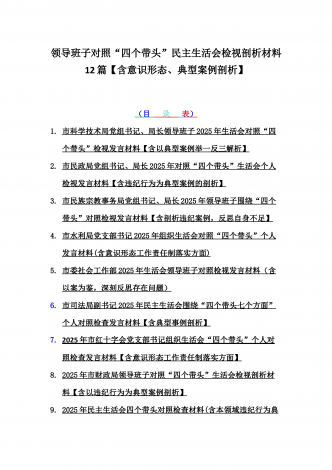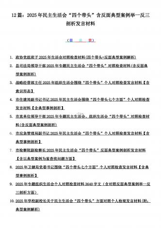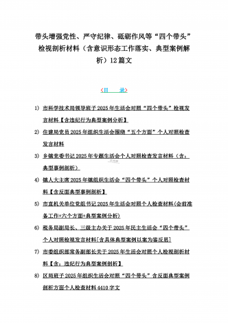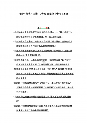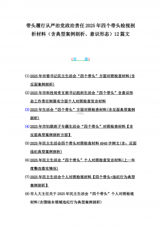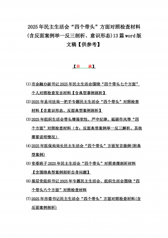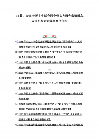 2025年民主生活会“四个带头”方面对照检查材料(含反面案例举一反三剖析、意识形态)13篇word版文稿【供参考】【目录】(1)市金融办副书记2025年民主生活会围绕“四个带头七个方面”个人对照检查发言材料【含典型事例剖析】(2)2025年县司法局一把手专题民主生活会“四个带头”对照检查材料【含意识形态、反面典型案例剖析】(3)2025年组织生活会带头增强党性、严守纪律、砥砺作风等“四个方面”对照检查材料(含:反面典型案例举一反三解析、其他需要说明情况)(4)2025年医保局局长民主生活会“四个...